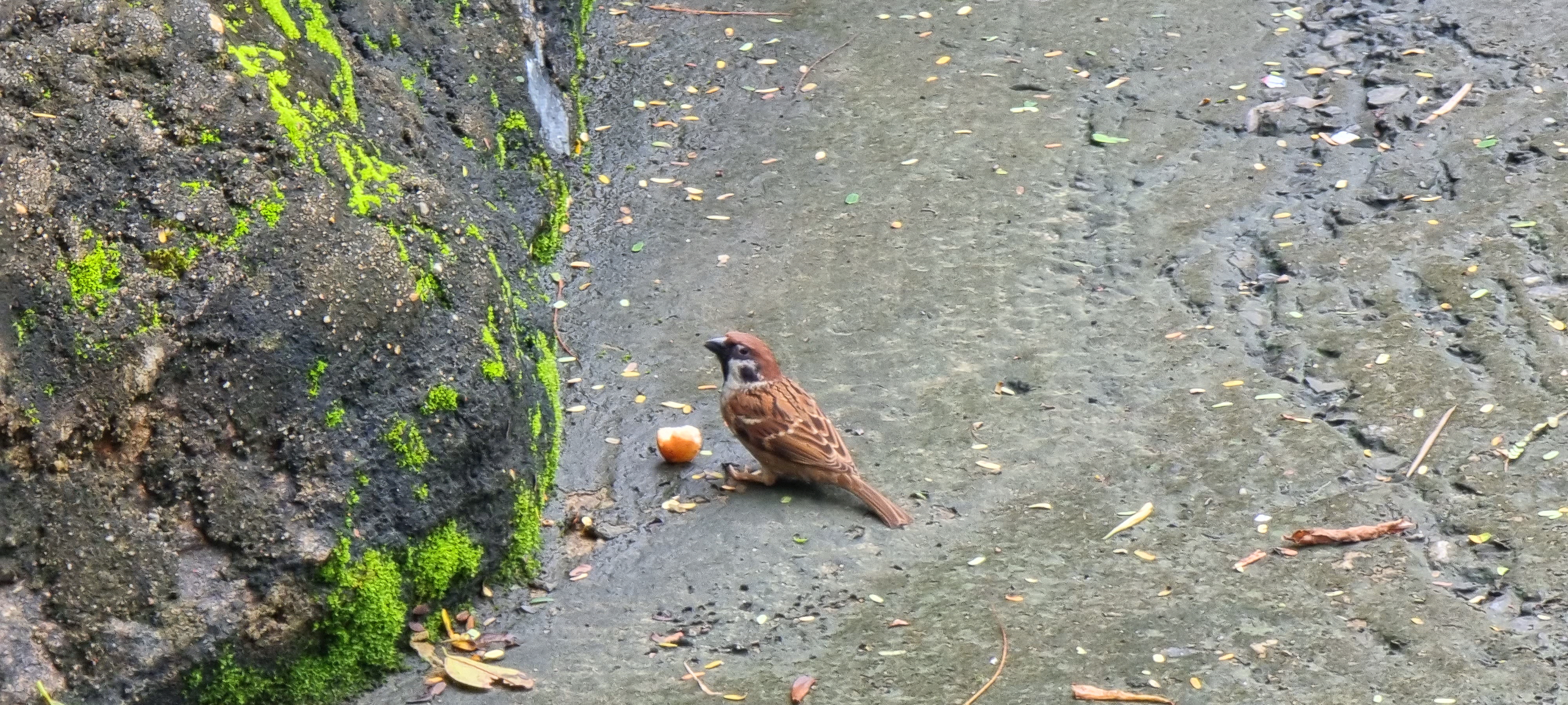 나무에서 떨어진 열매를 쪼는 참새입니다.