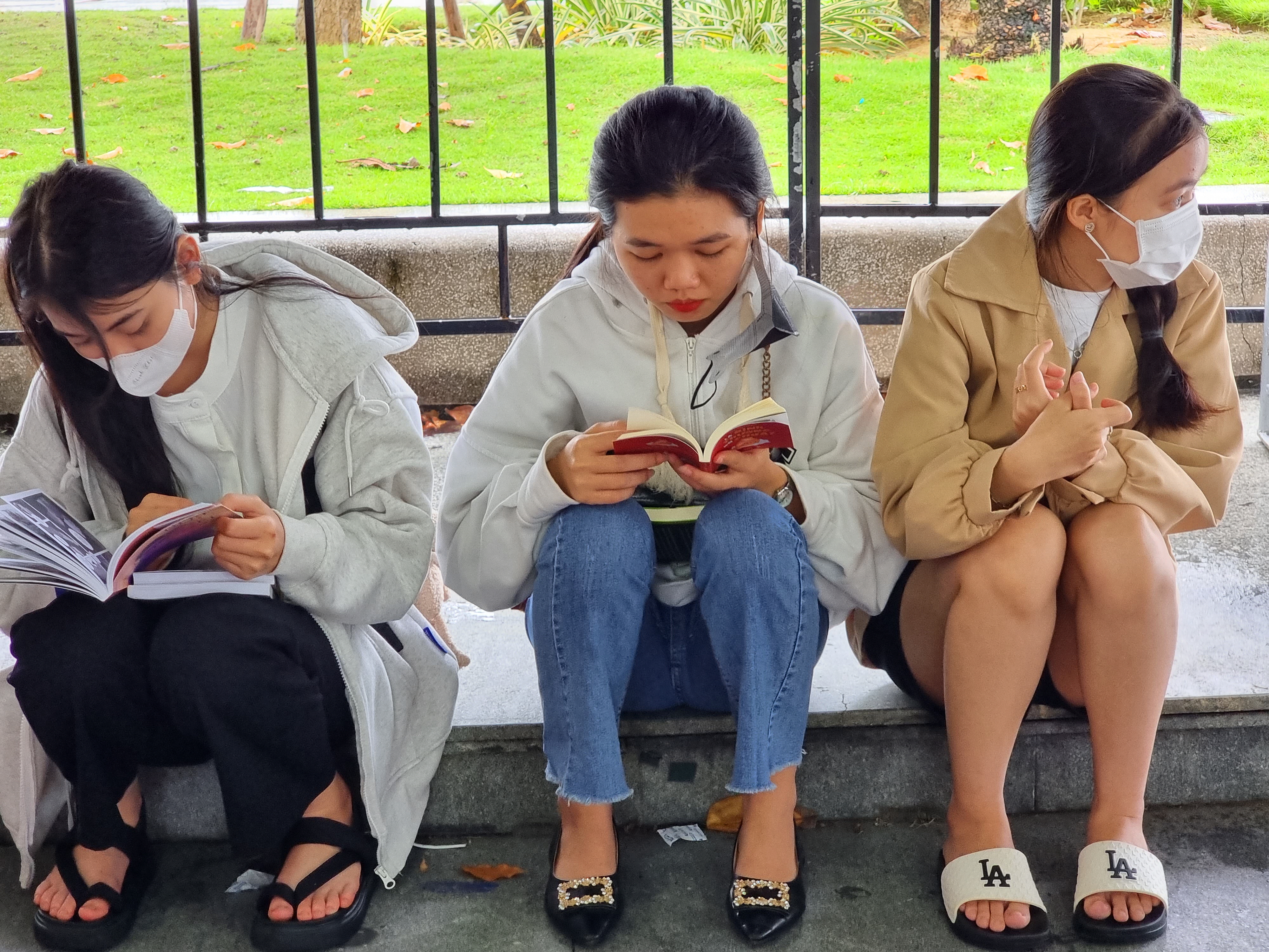 주저앉아서 책을 읽고 있네요.