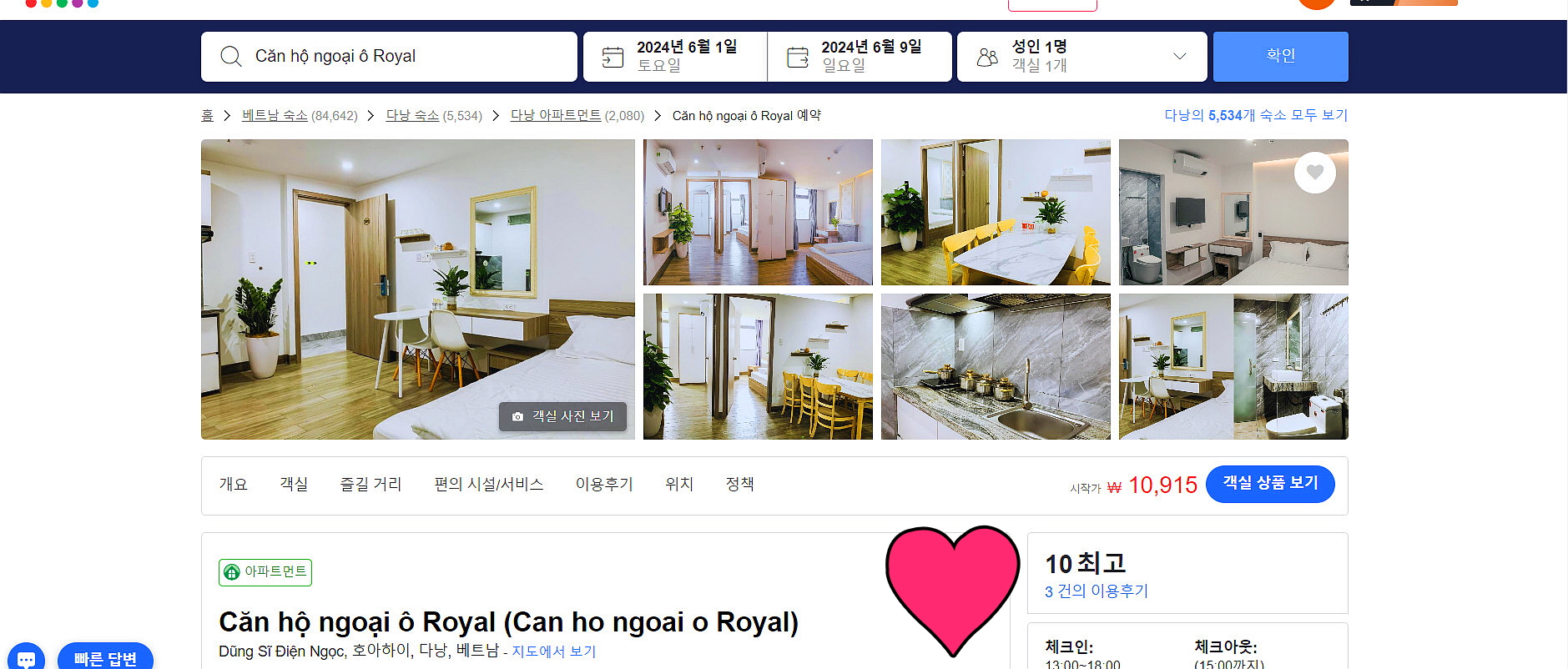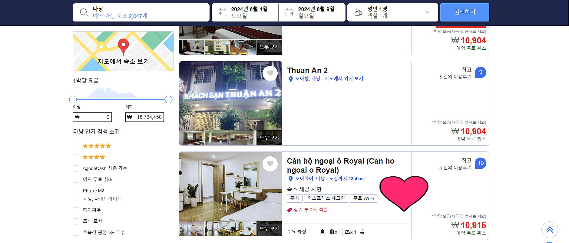 빨간 하트 표시가 되어있는 호텔을 크릭 해 보겠습니다.