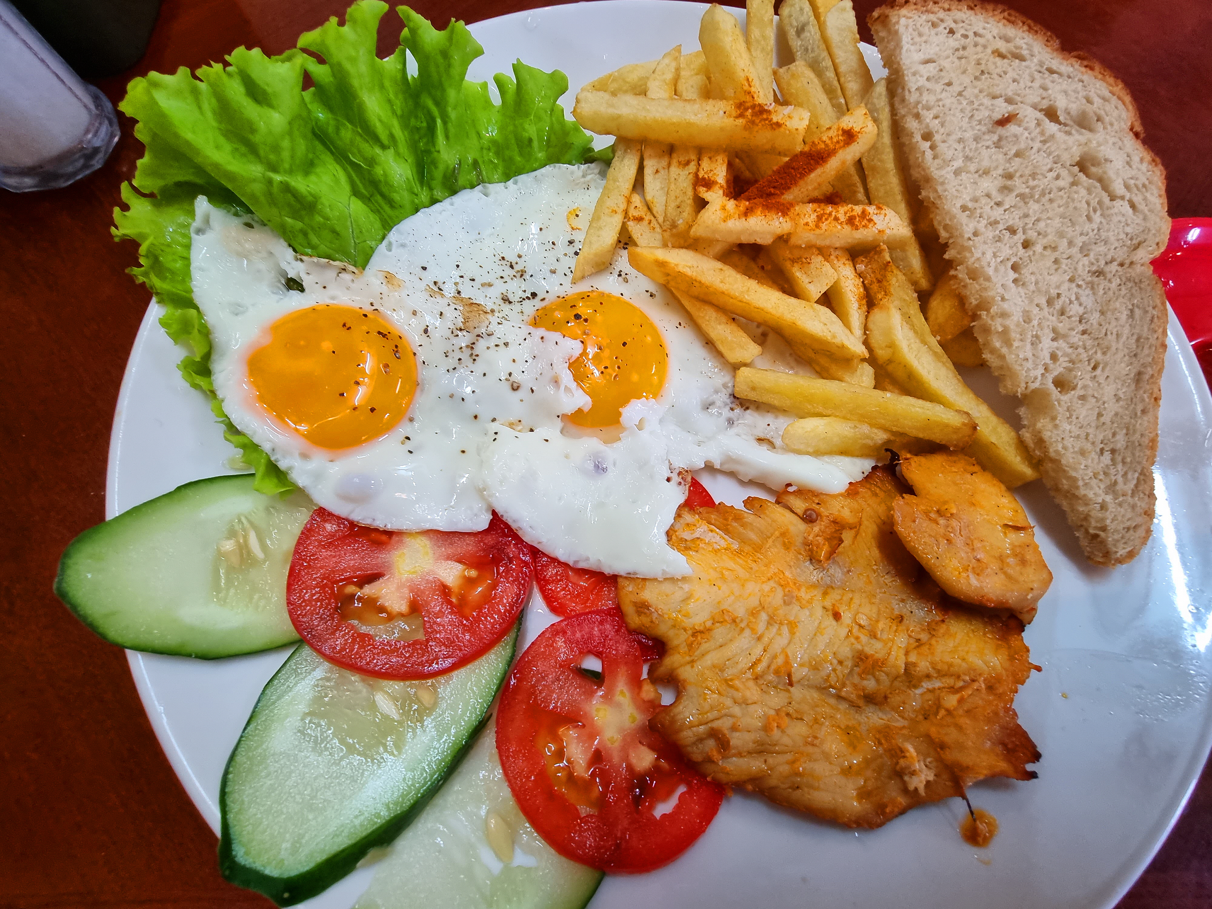 토마토, 계란프라이 두 개, 오이, 상추입니다.