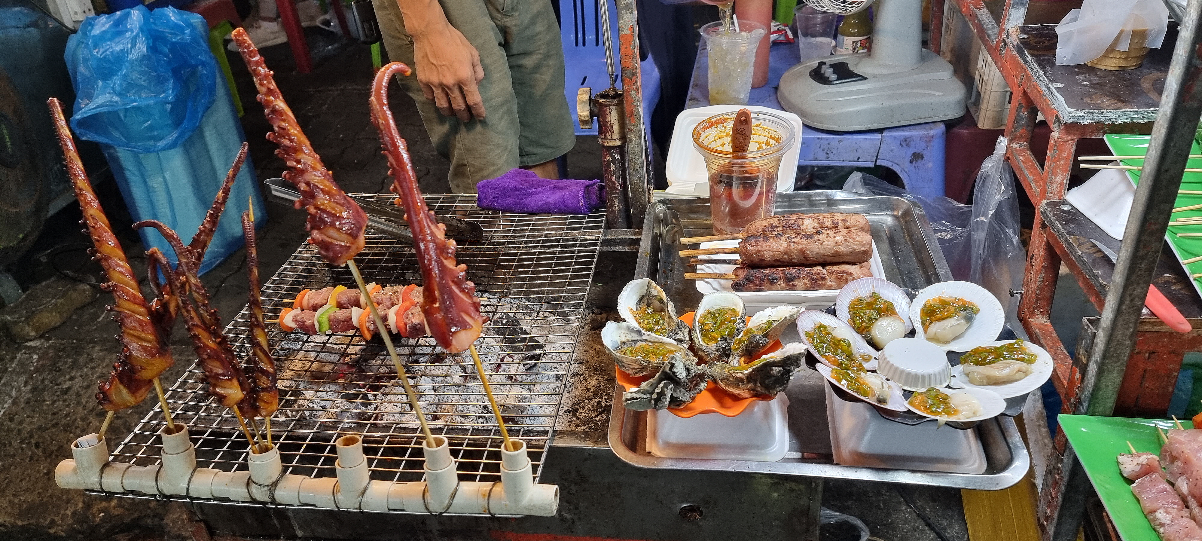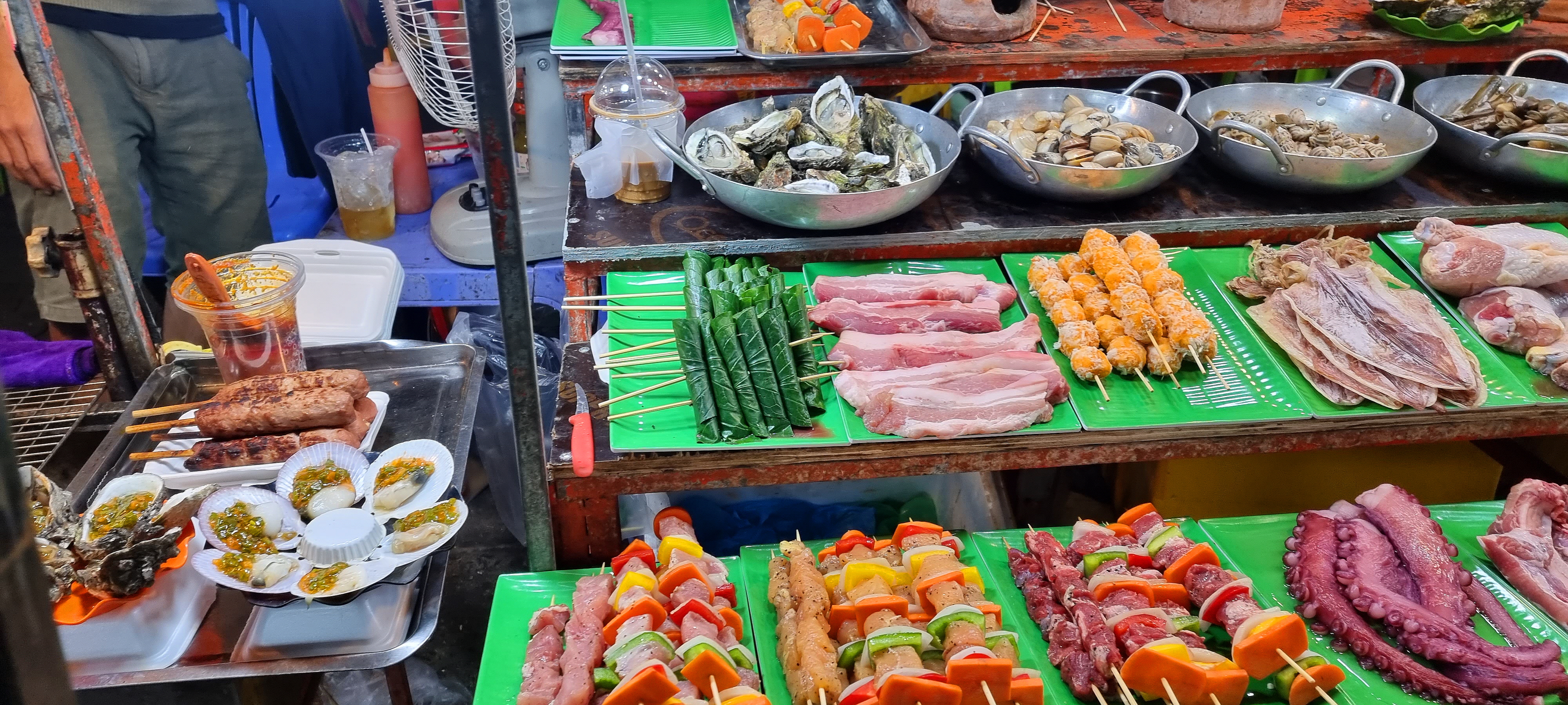 오늘 팔지 못한 해산물들과 꼬치구이들은 내일 다시