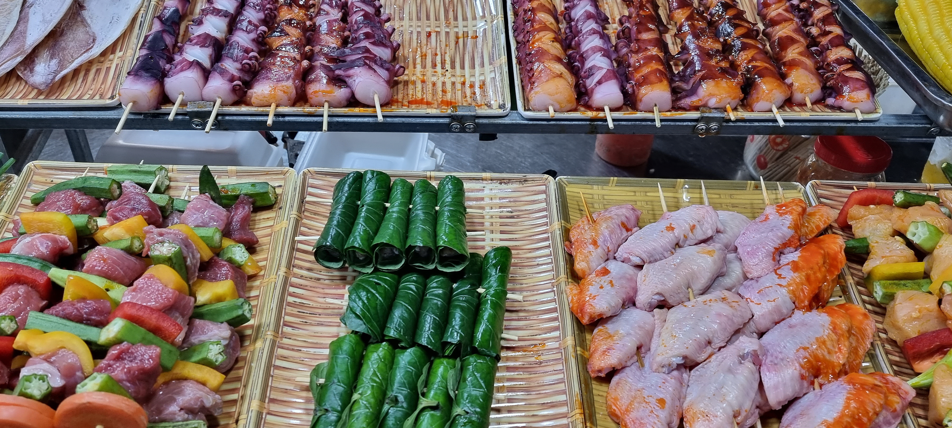 오늘 팔지 못한 해산물들과 꼬치구이들은 내일 다시
