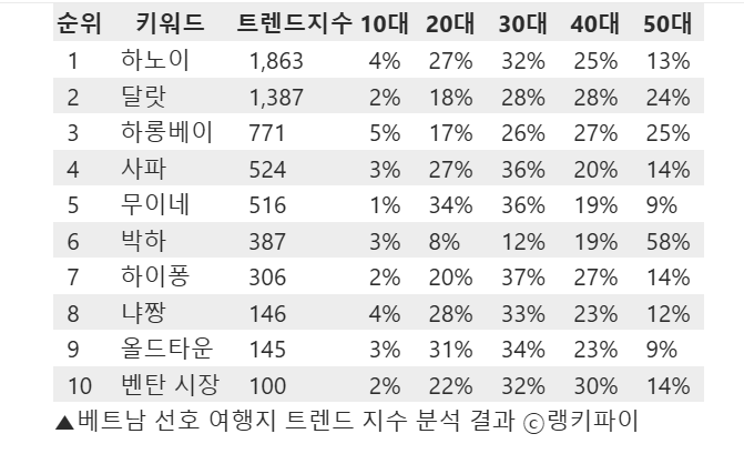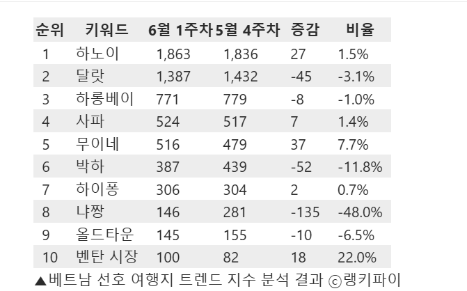 베트남 선호 여행지 이슈에 따른 구체적인 순위 및