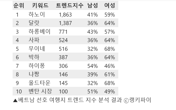 1위 하노이는 남성 41%, 여성 59%, 2위 달랏은 남성 36%,