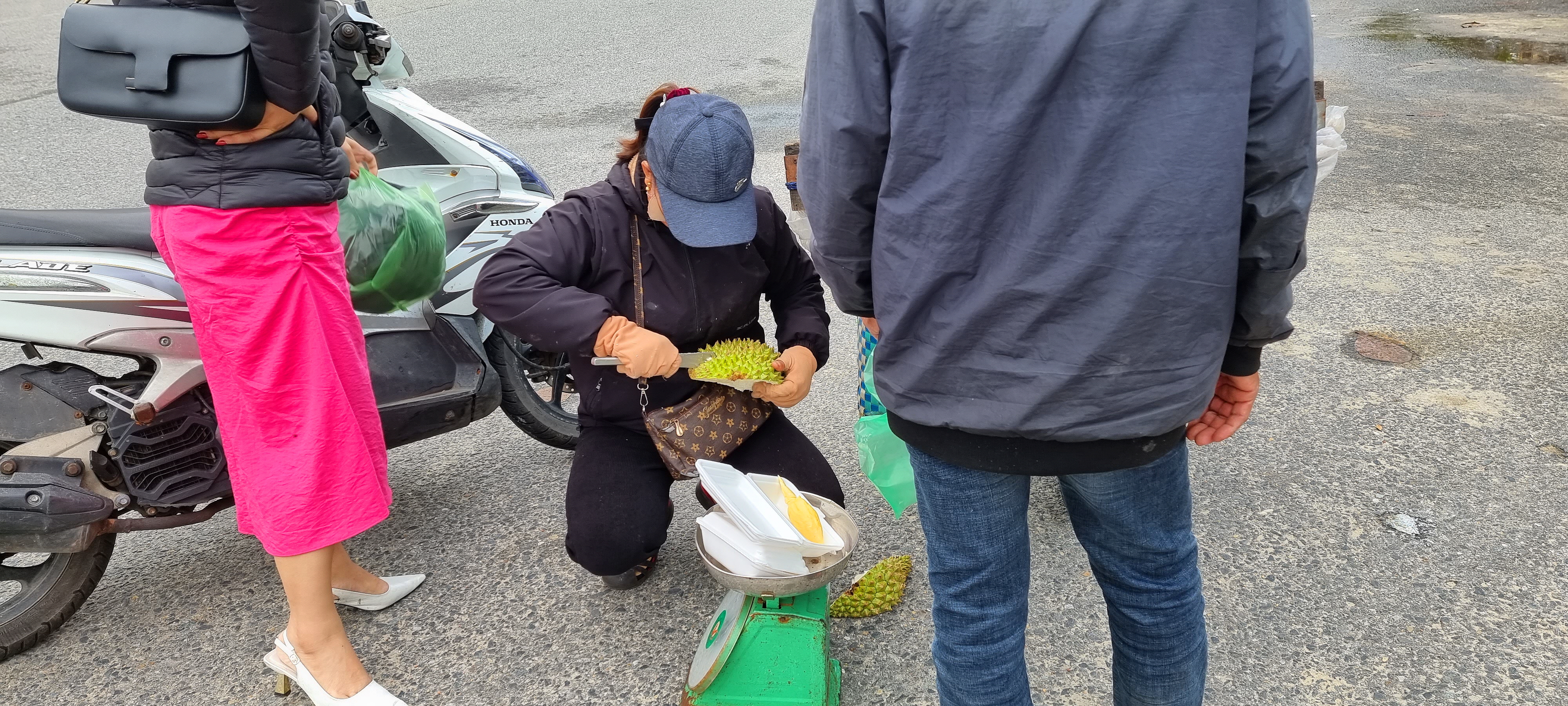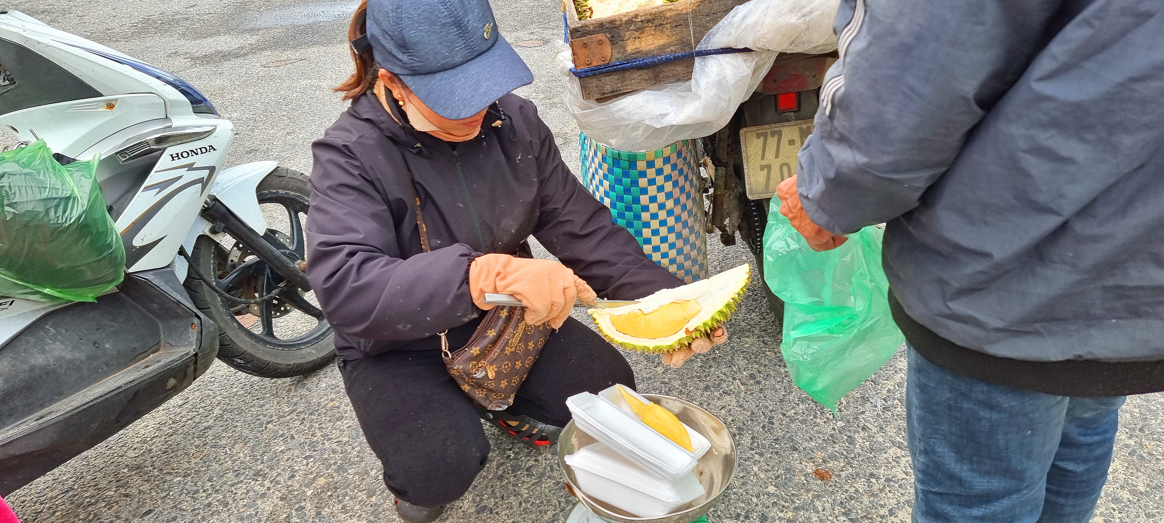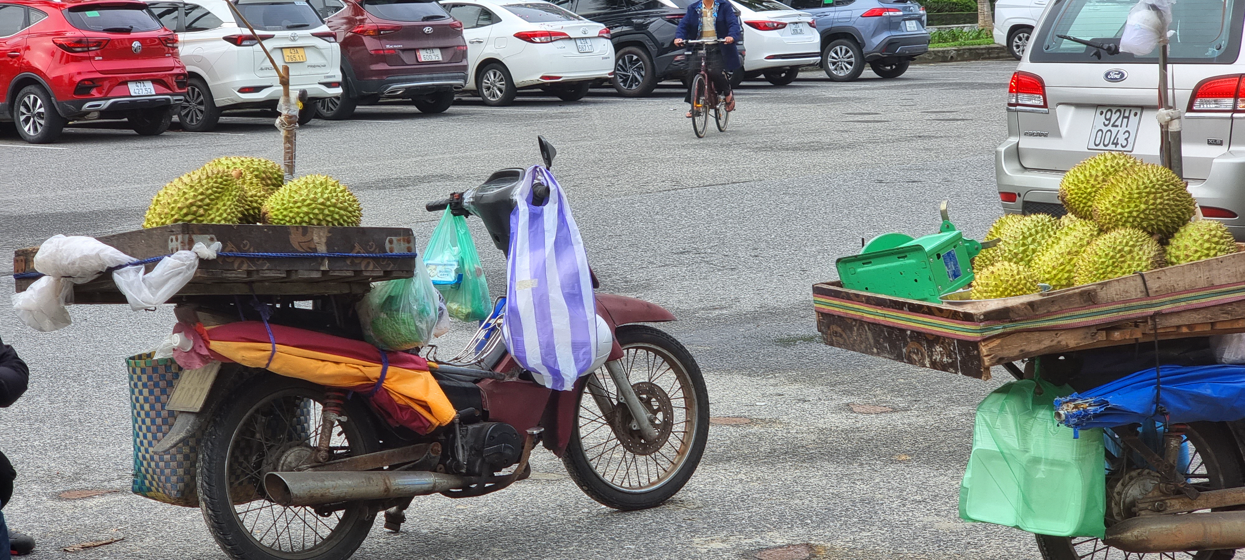 오토바이에 두리안을 실은 장사치들이