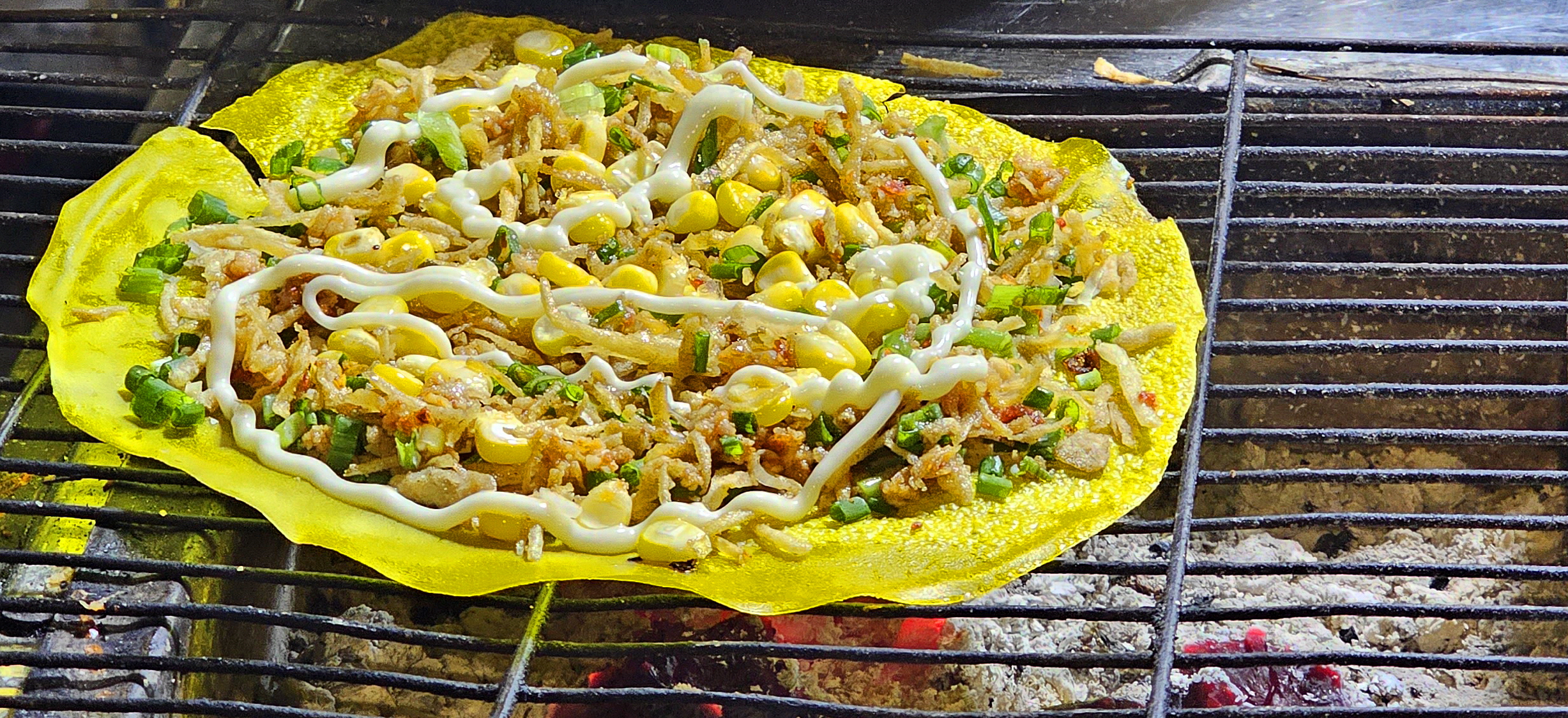 제가 주문한 반쎄오를 숲불 위에 굽고 있습니다.