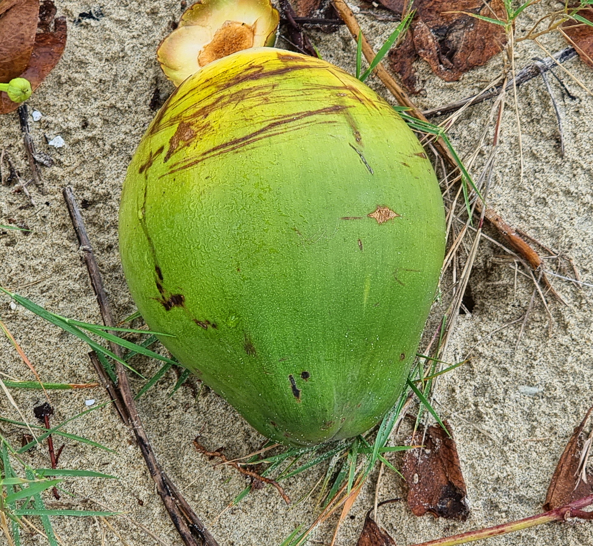 코코넛 열매가 떨어져 파도에 휩쓸려 여러 곳으로