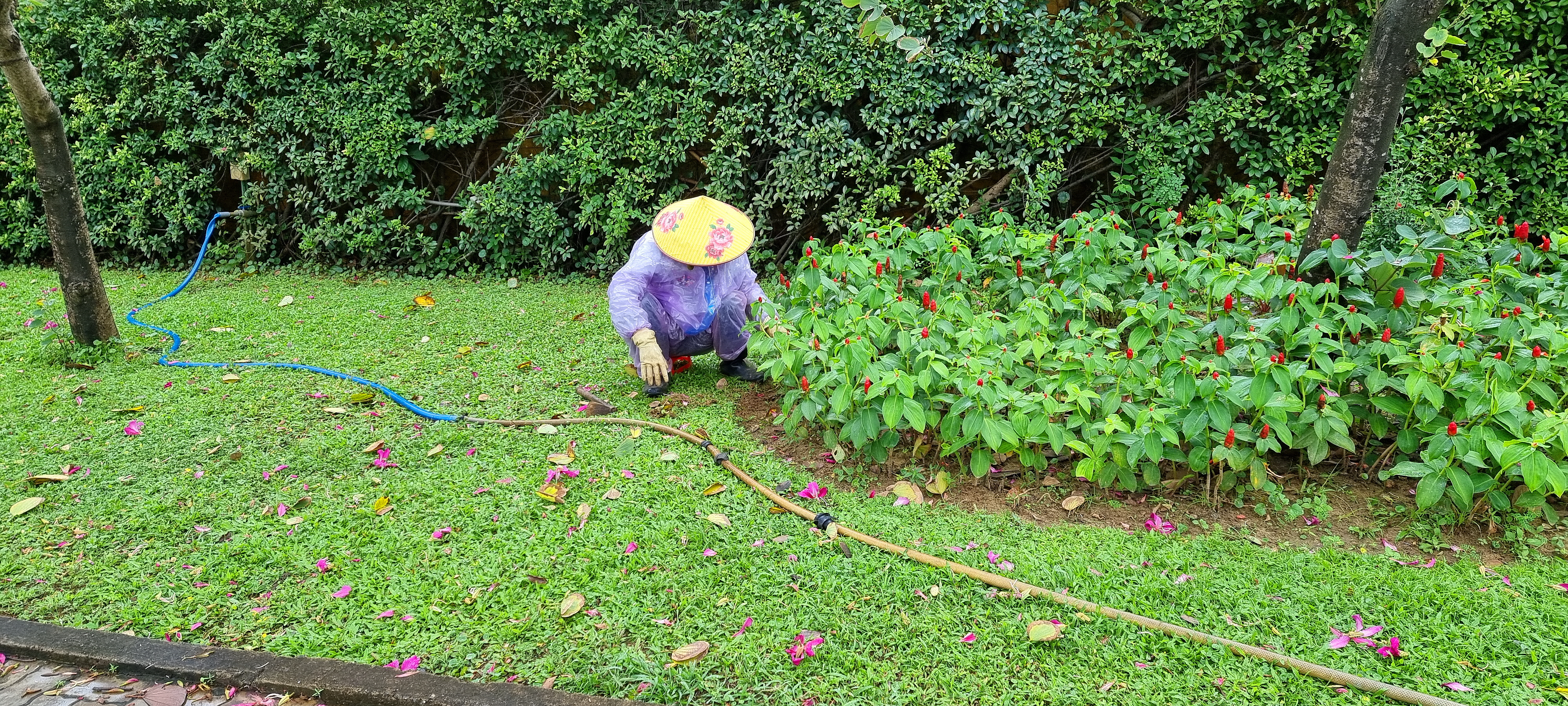 내리는 비를 맞아 가면서 정원 손질을 하시네요.
