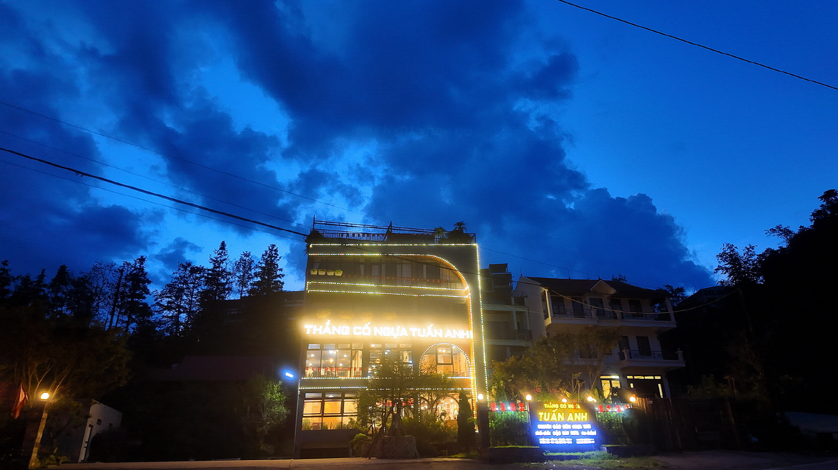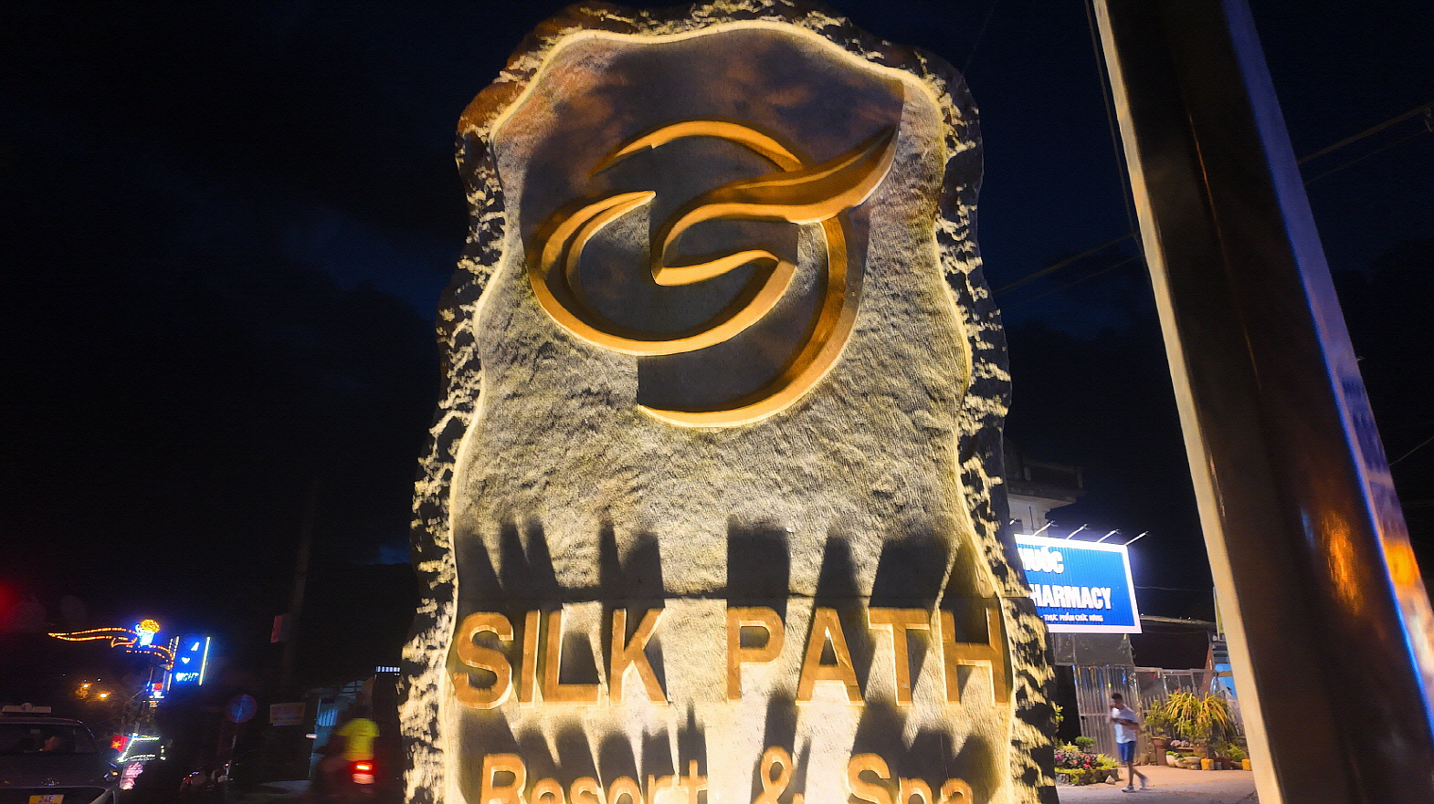 마치, 구림이 달에 걸려 있는 리조트의 간판을 보며