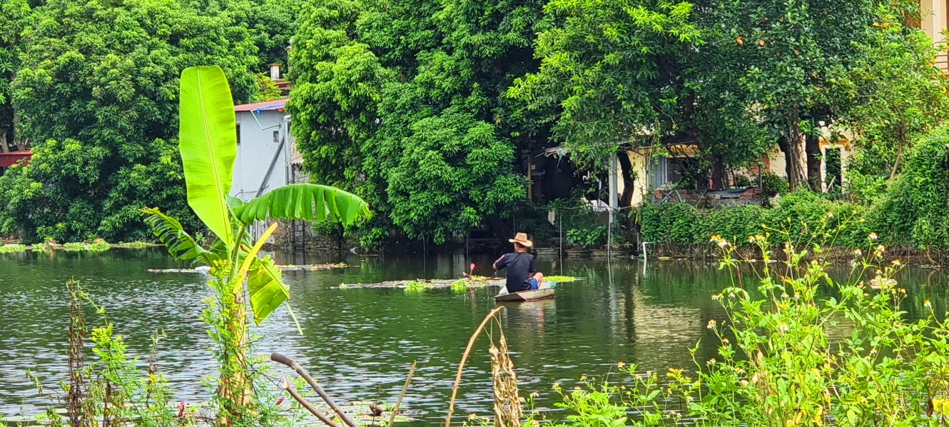 동네 청년이 쪽배를 타고 고기를 잡네요.