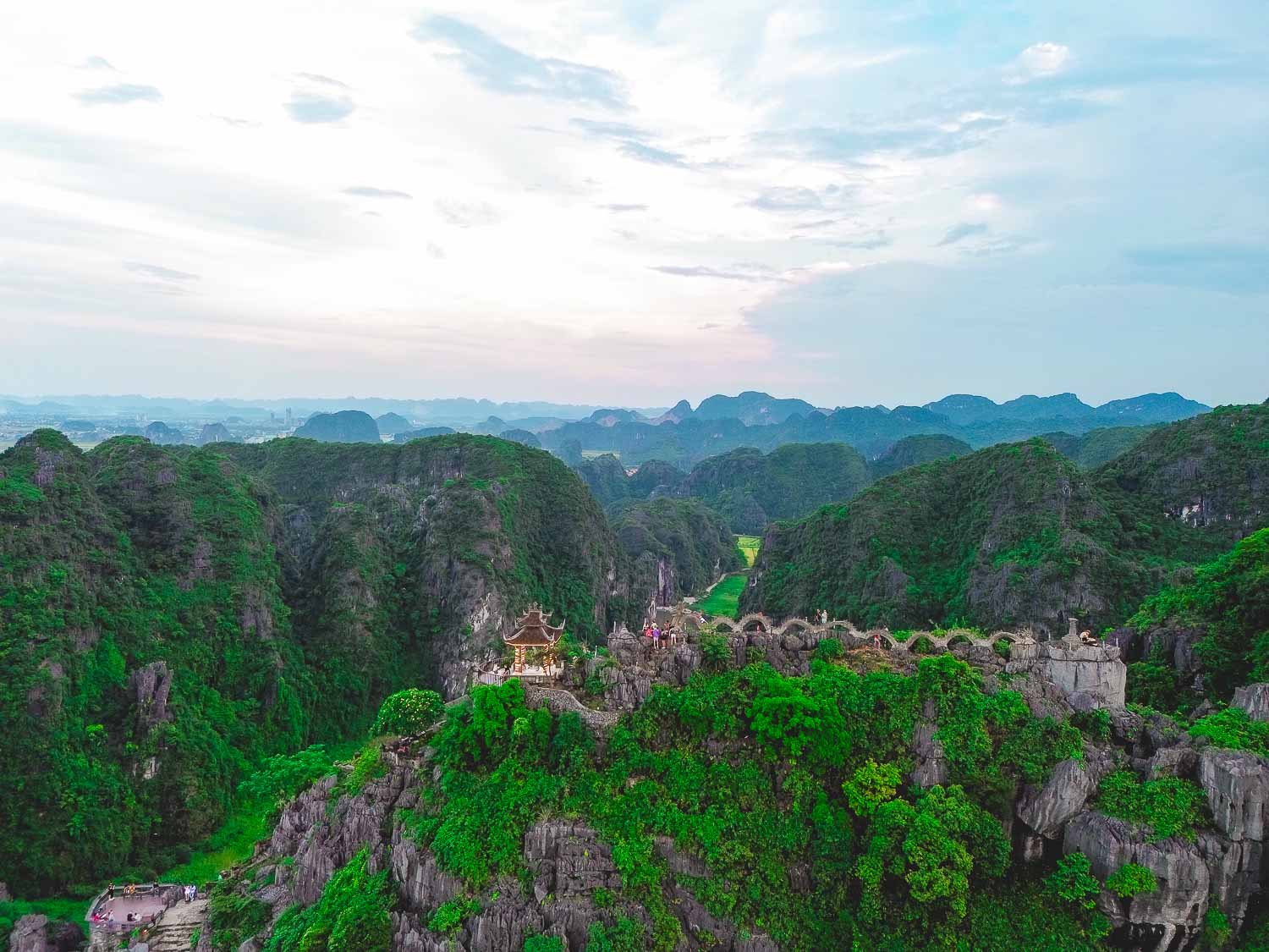 배경으로 겹겹이 펼쳐진 석회암 카르스트 지형이