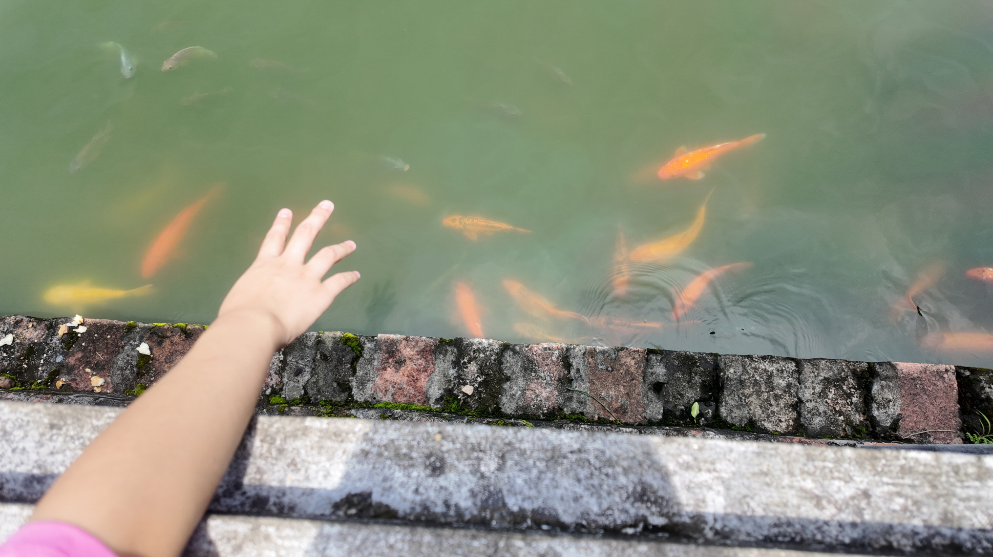 아이가 잉어를 만지려고 하네요.