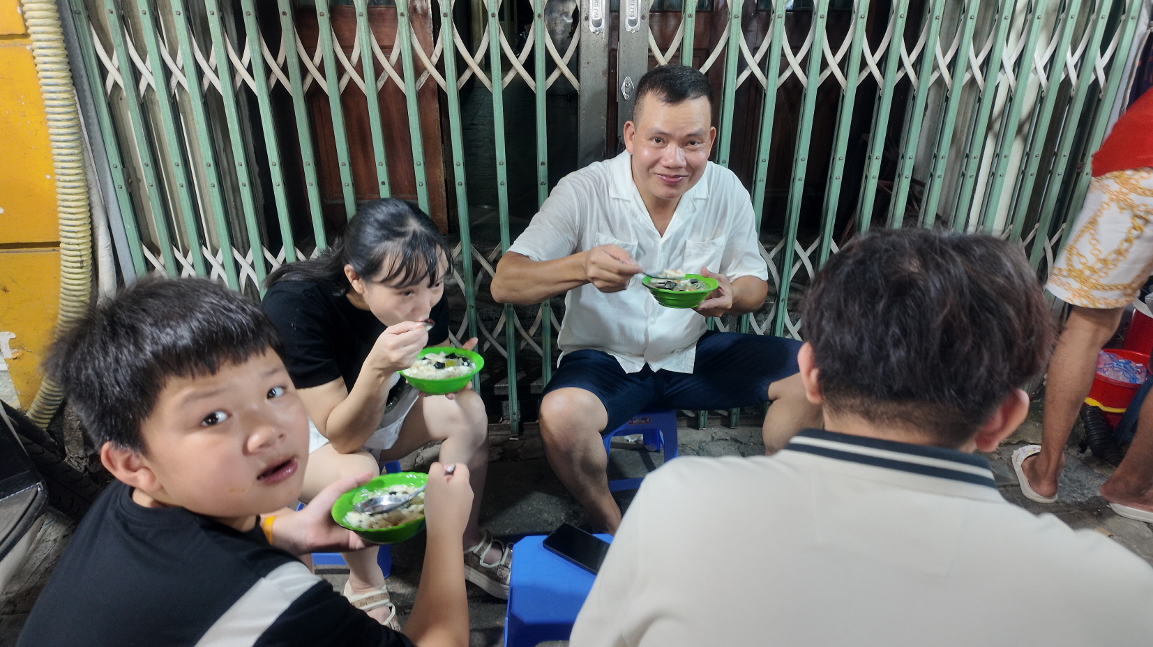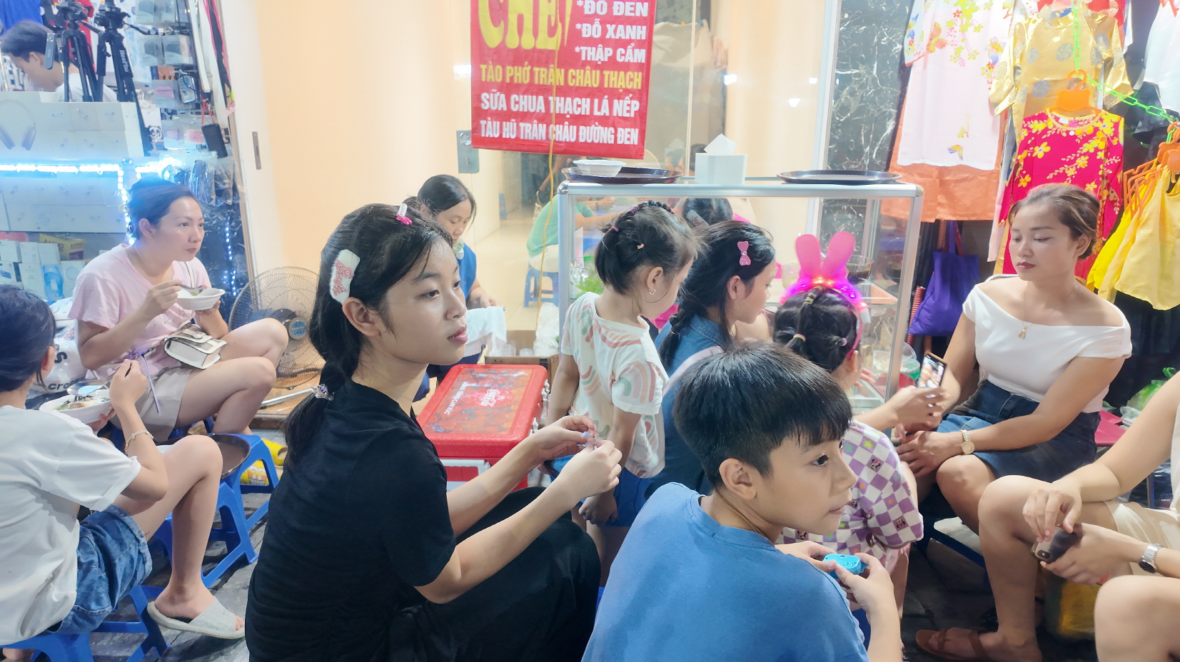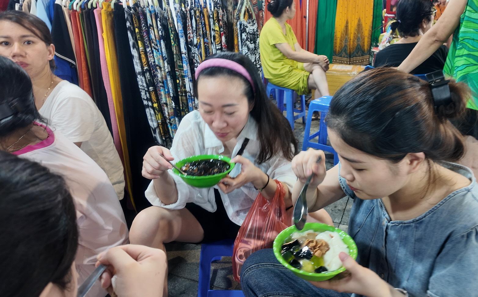 야시장을 둘러보다가 다들 목욕탕 의자에 앉아