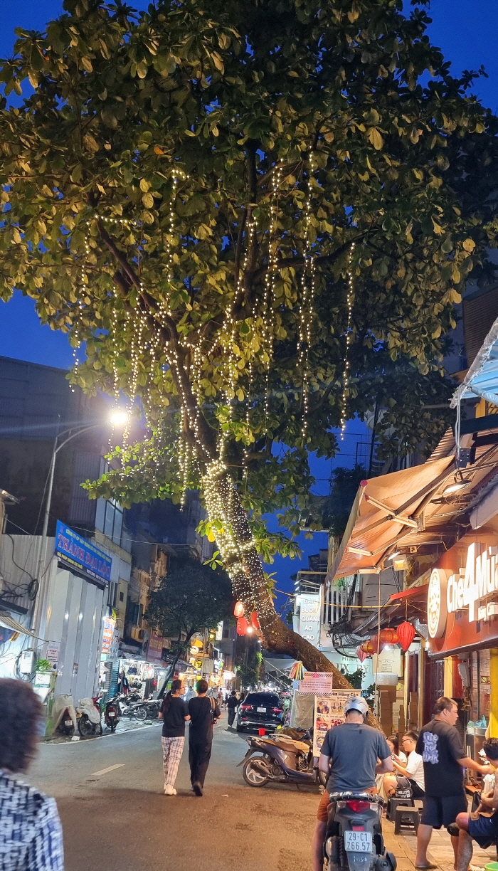 나무에 화려하게 조명을 달아 놓았습니다.