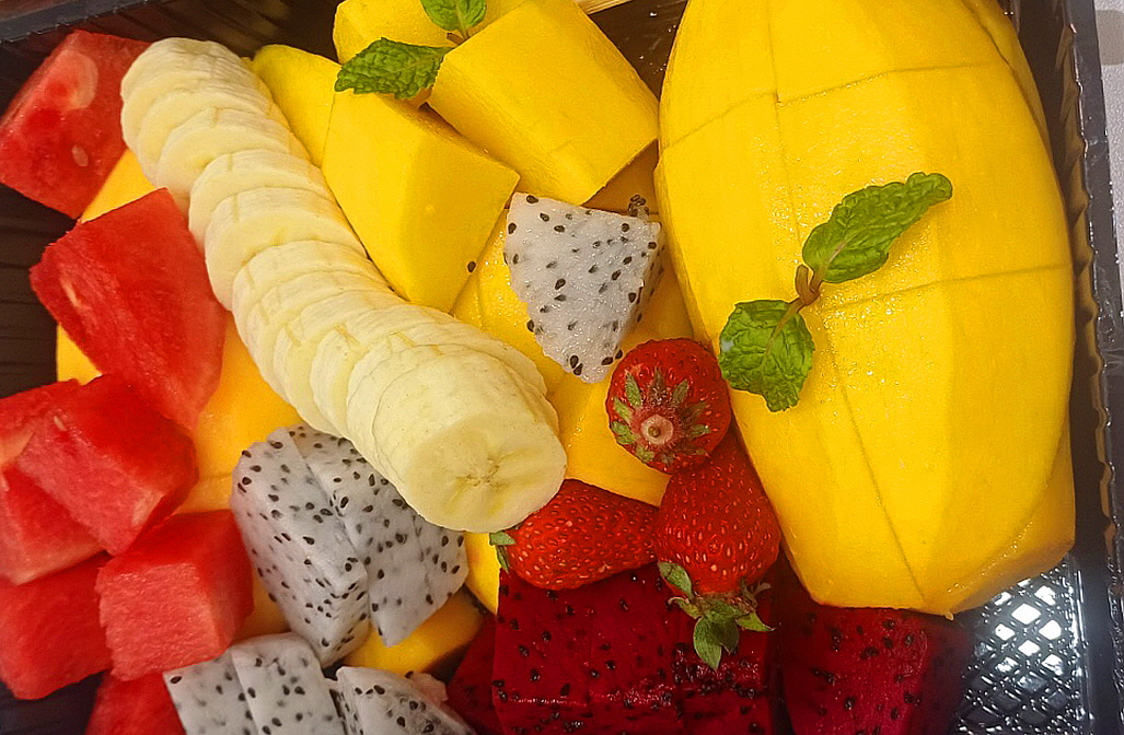 수박, 딸기, 바나나, 용과와 망고입니다.