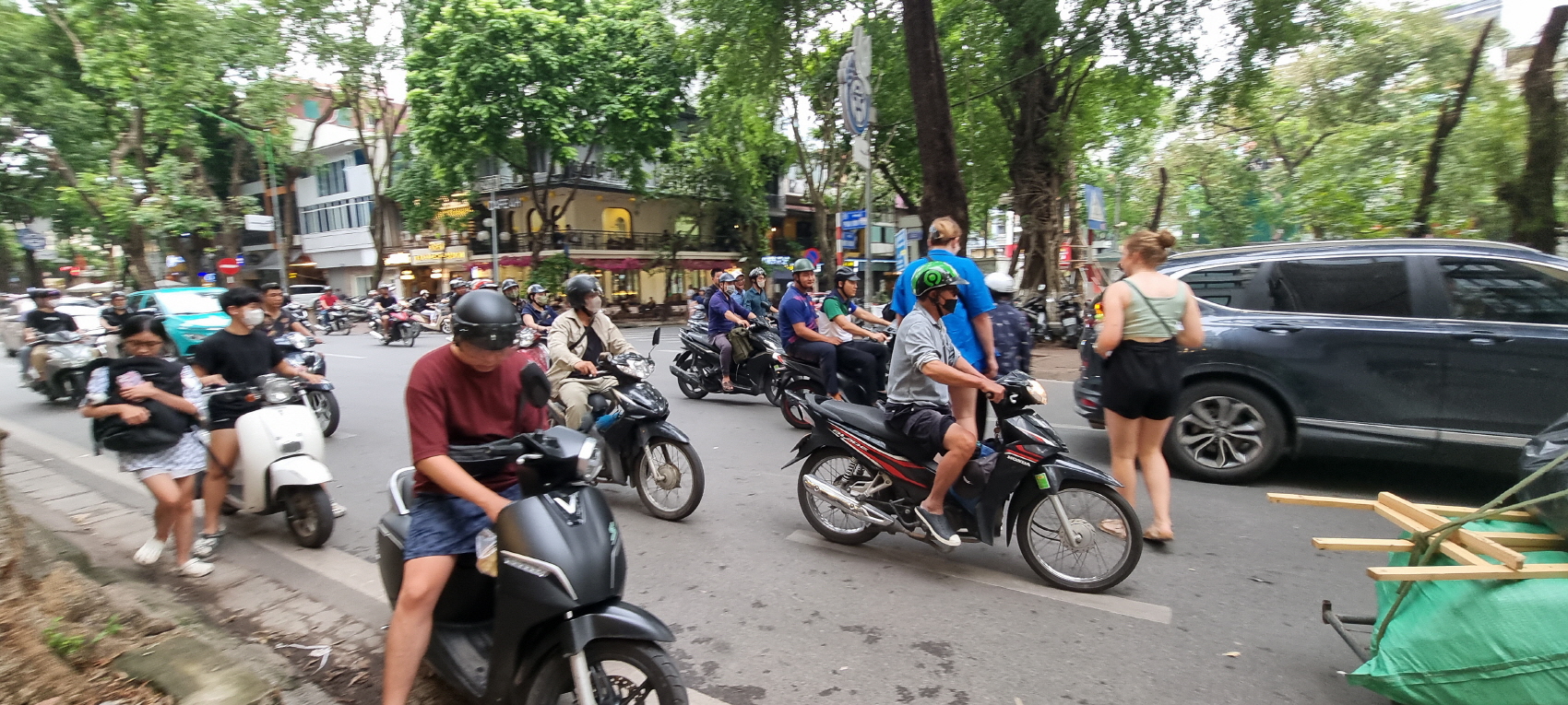 절대, 뛰어서 건너지 마시고 천천히 오토바이 흐름에 따라