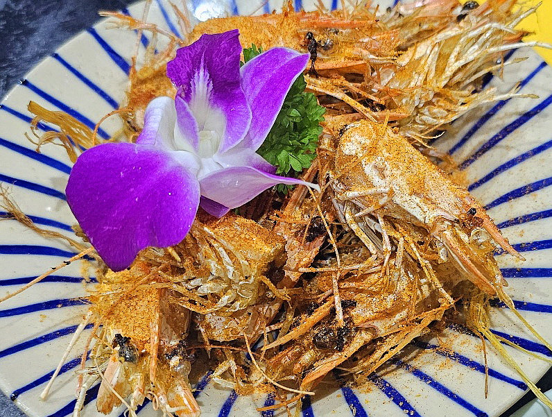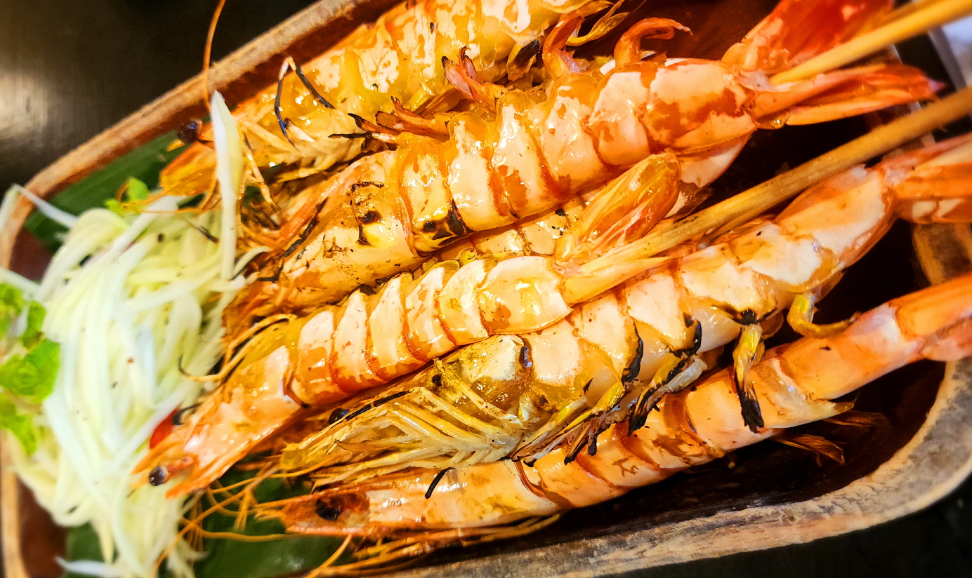 새우를 꼬치에 끼워 숯불에 구워 나옵니다.