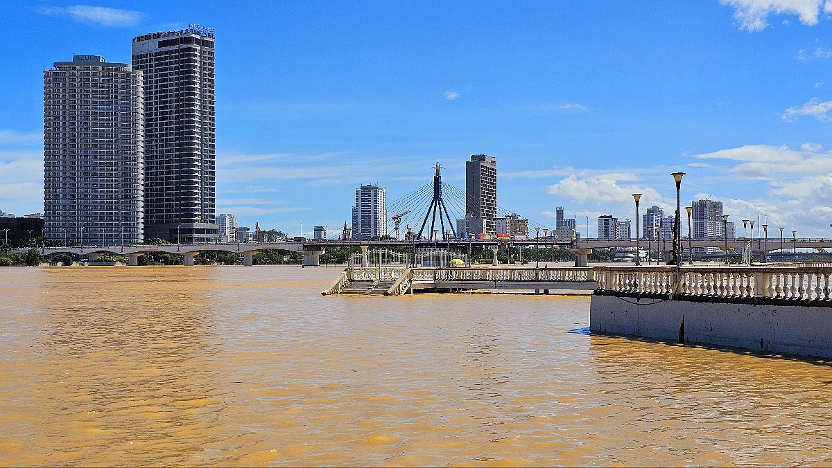 많은 비가 내려 다낭에 있는 한강이