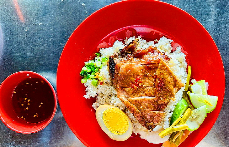 껌땀은 으깬 쌀(gạo tấm)로 지은 밥 위에