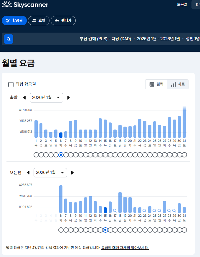 2026년 1월 날짜별 항공요금 변화입니다.