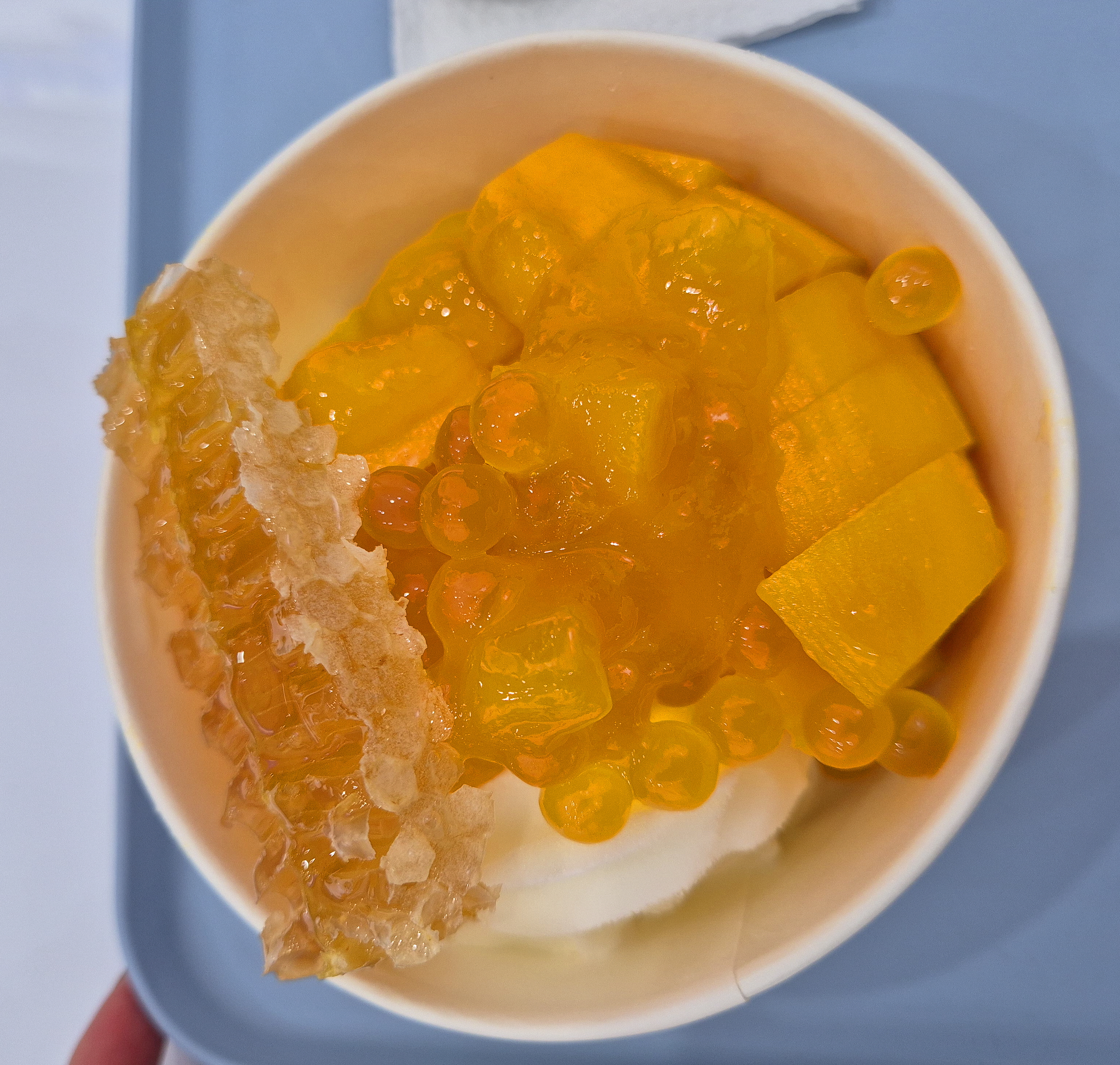 망고빙수에 꿀을 얹은 달콤한 맛입니다.