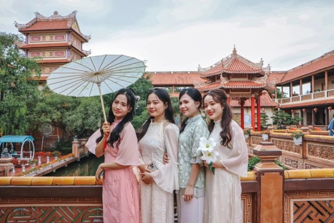 전통 베트남 의상 인 아오자이를 입고 사진을 찍으며