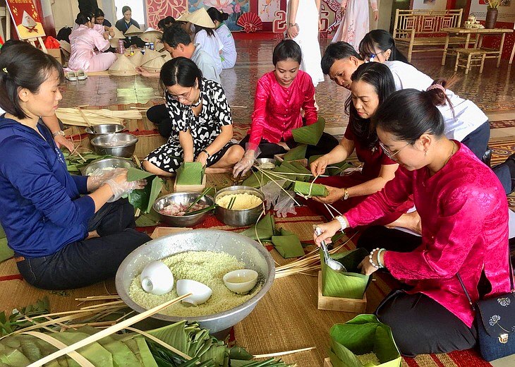 박물관에서 관광객들이 반쭝(베트남 전통 떡)