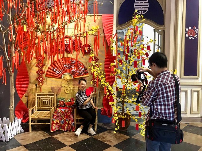 관광객들이 전통적인 설날 장식으로 꾸며진 공간에서