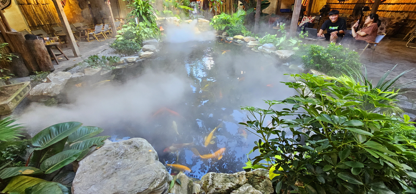 연못에서 노니는 잉어들과의