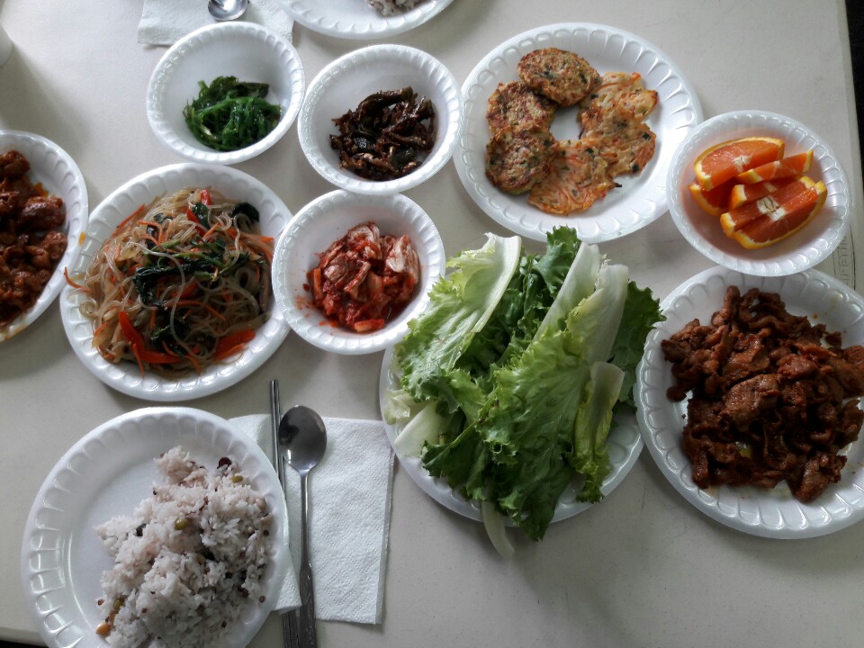 돼지불백에 야채전 두 가지와 멸치조림, 미역국, 상추, 해파리 무침, 김치, 잡채와
