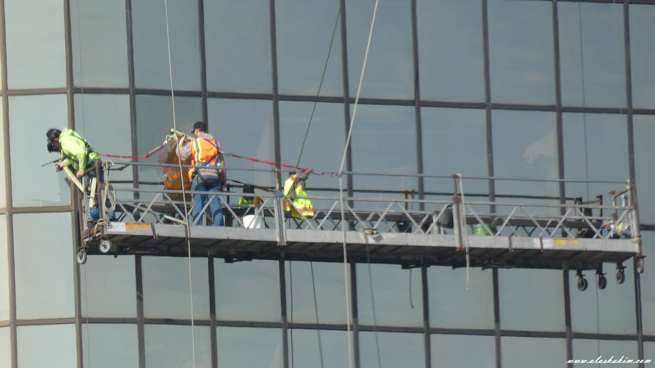 세명이 한조를 이뤄 유리 창을 닦는 모습인데,