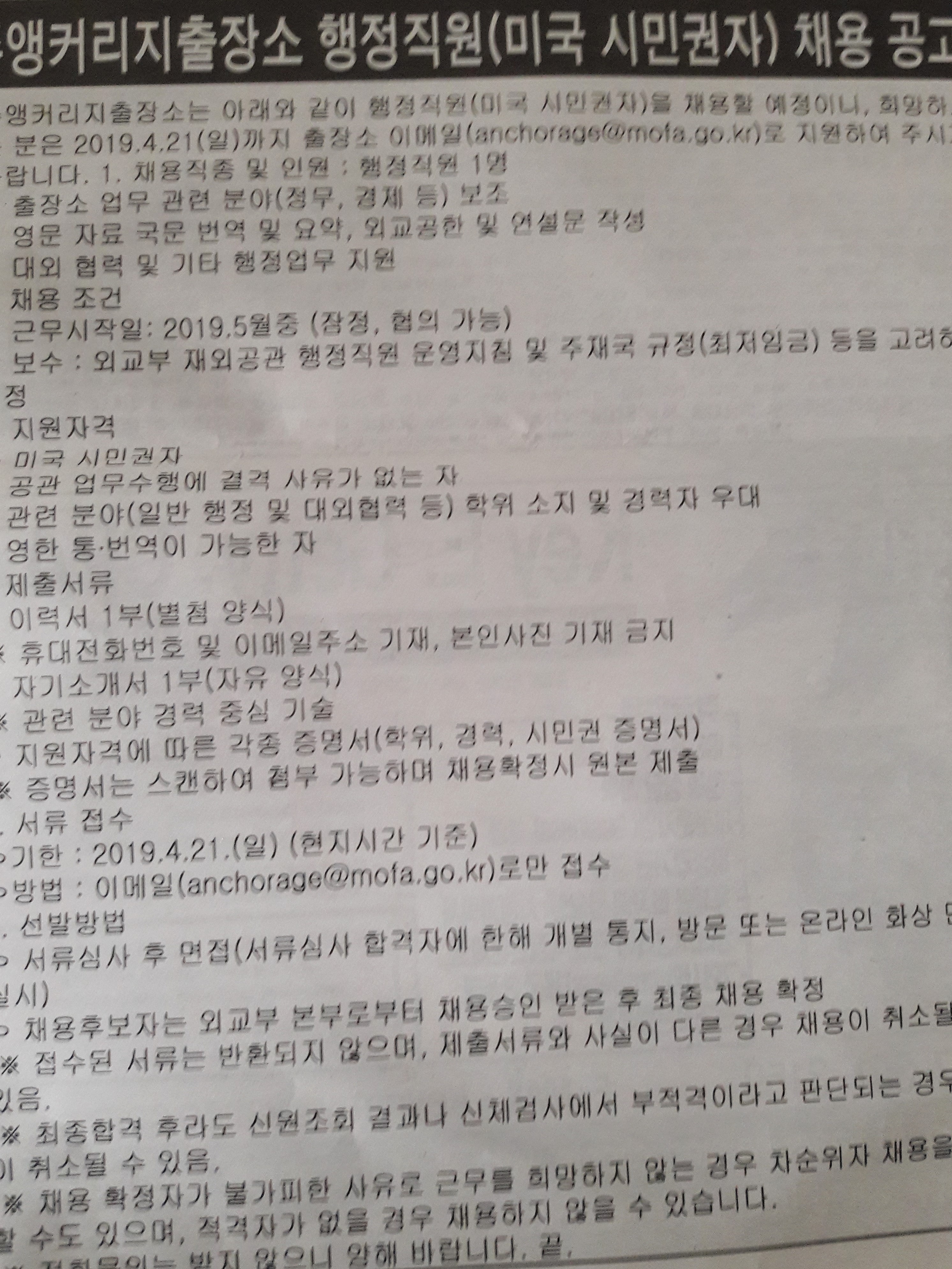대한민국 알래스카 영사 출장소에서 직원을 모집하고 있으니