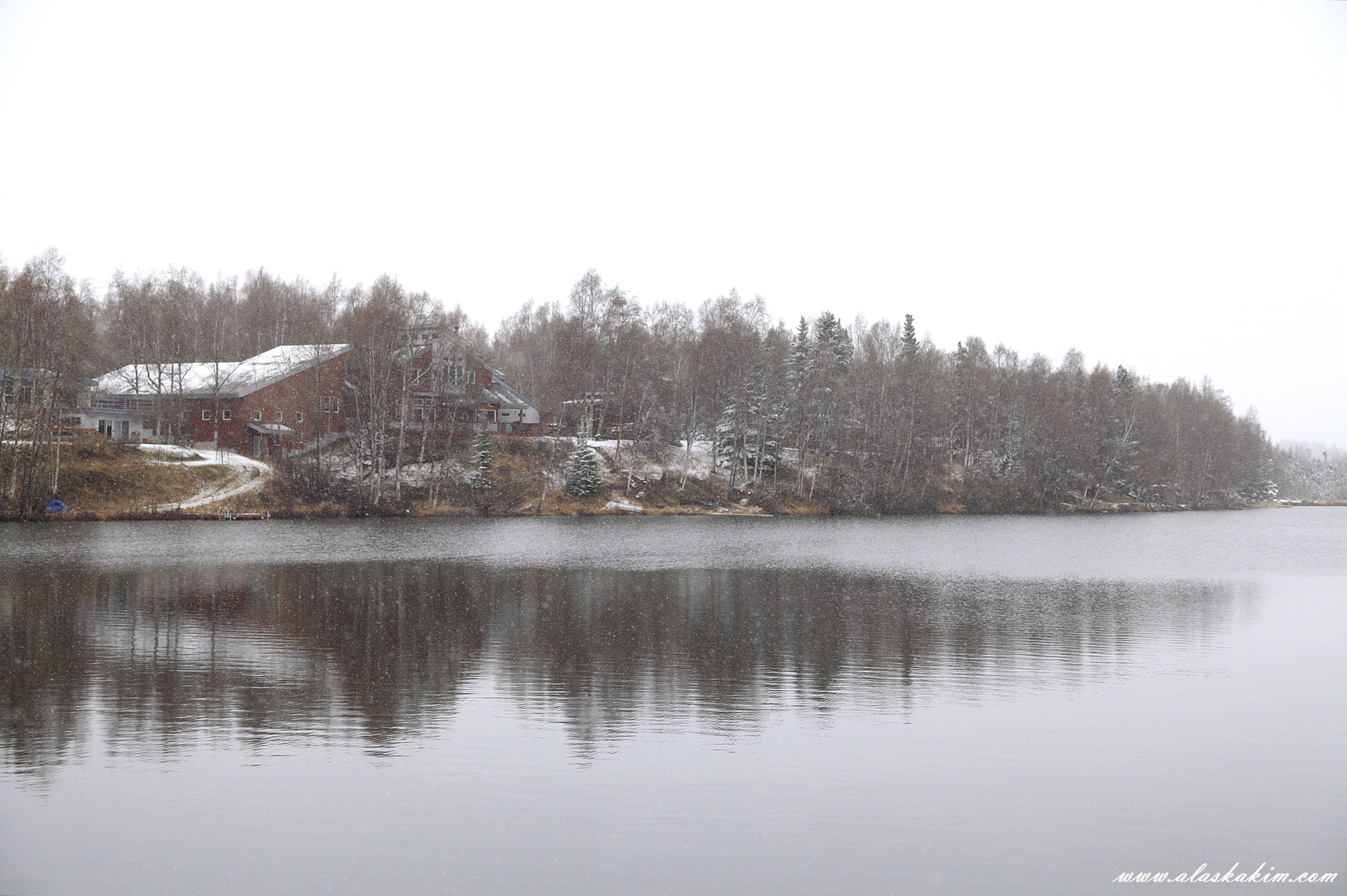 눈 내리는 모습을 감상하기 위해 호수에 잠시 들렀더니,
