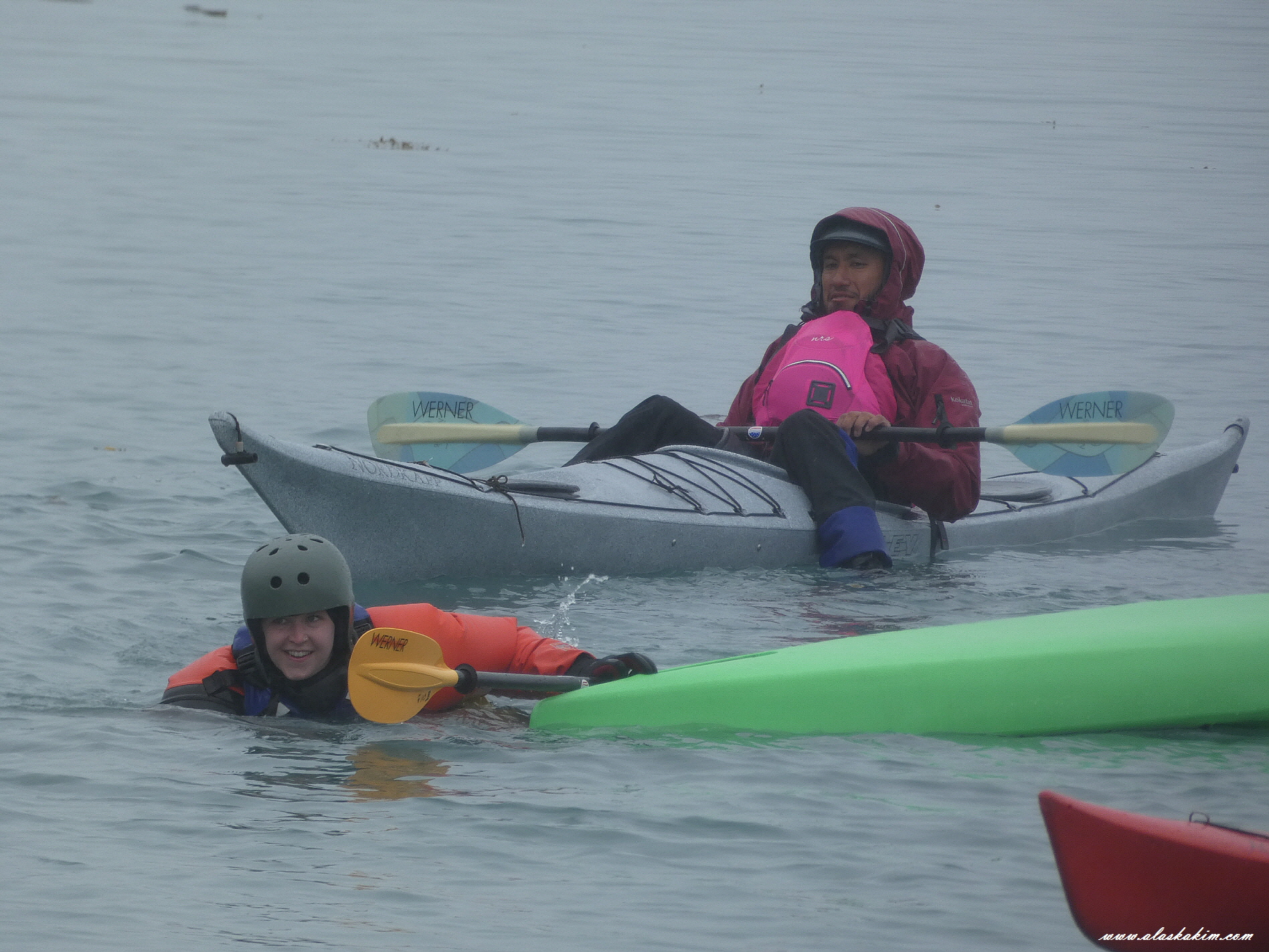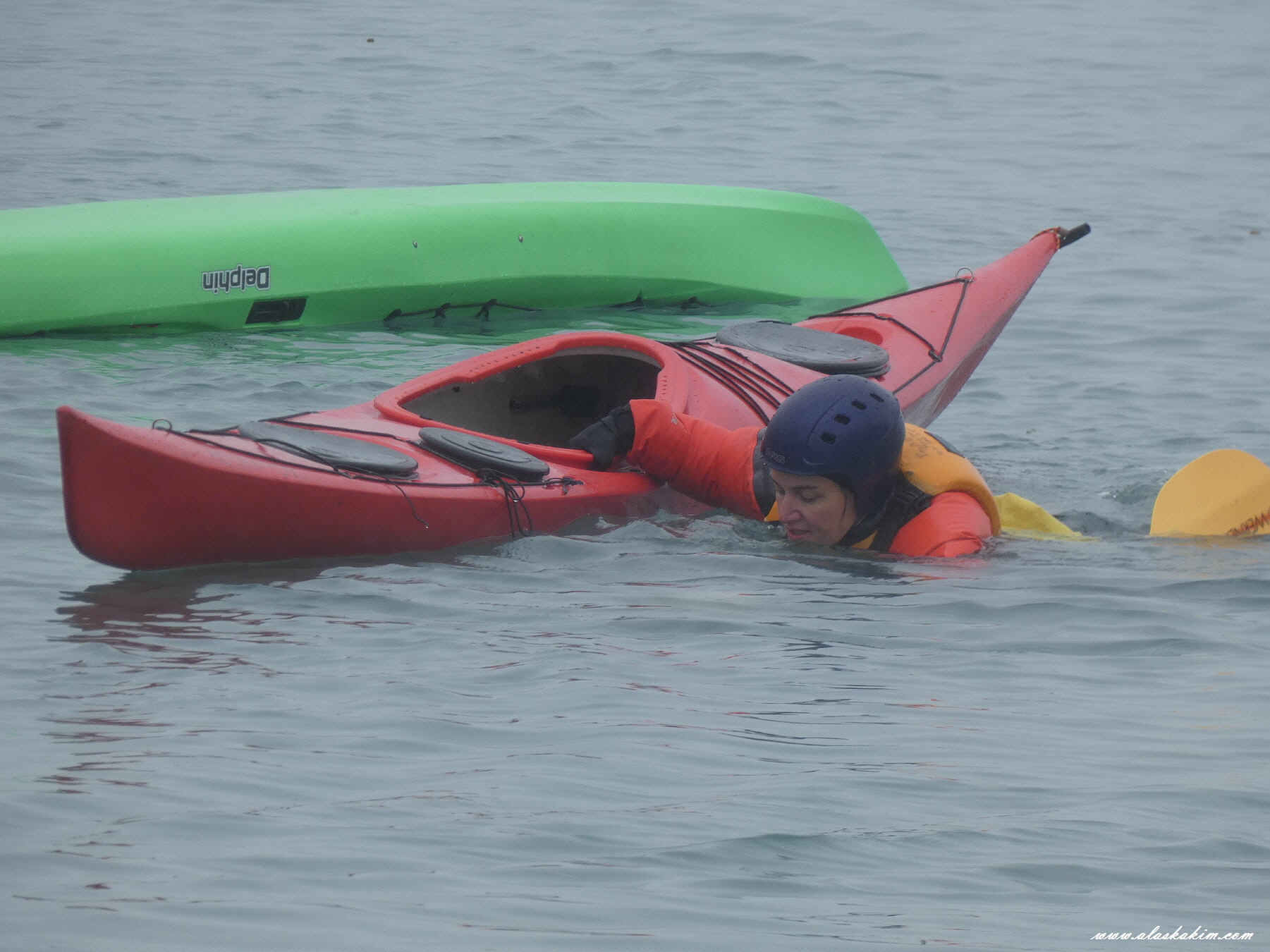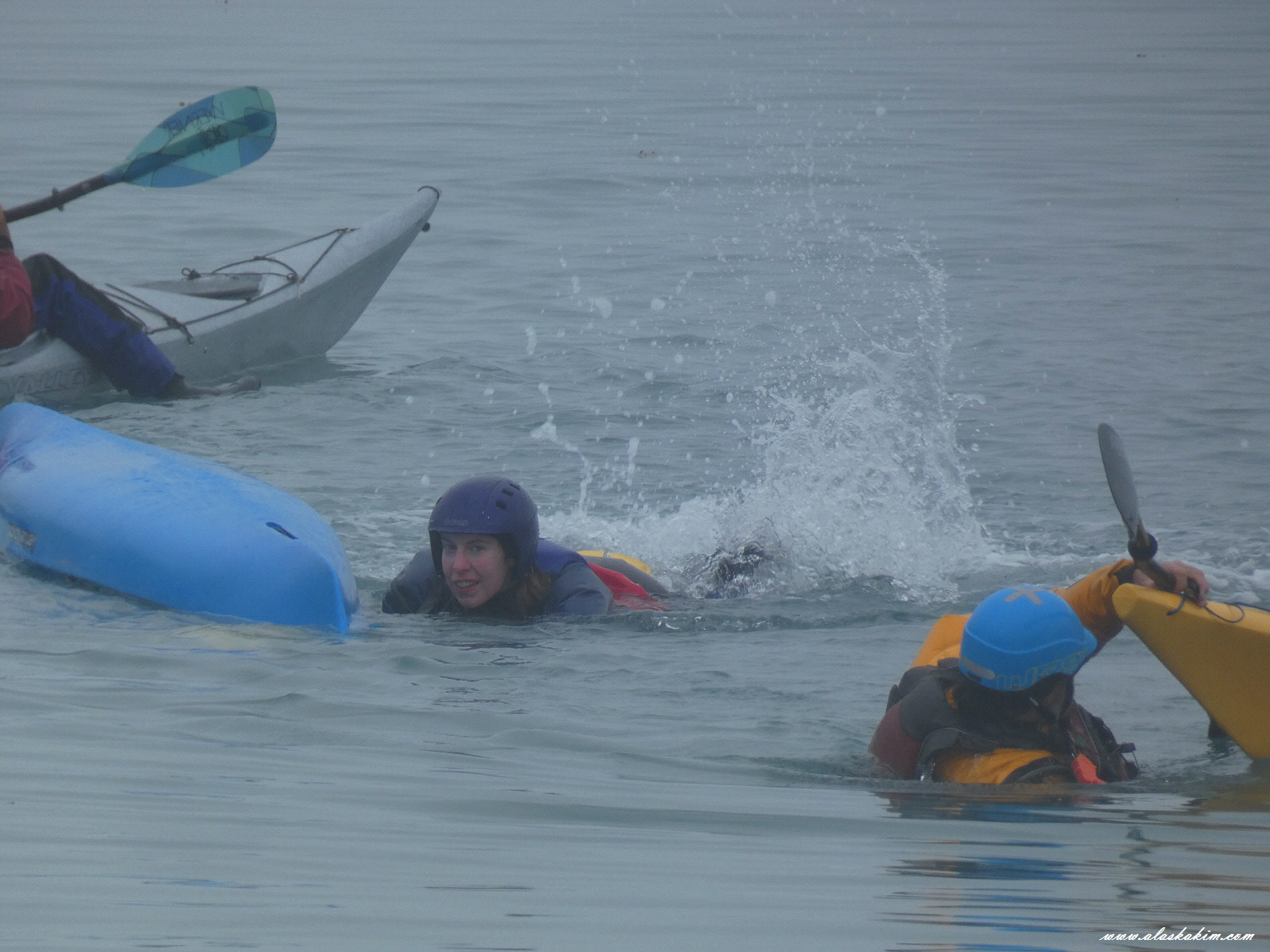 카약이 뒤집어졌을 때를 대비해 수영을 하고 있습니다.