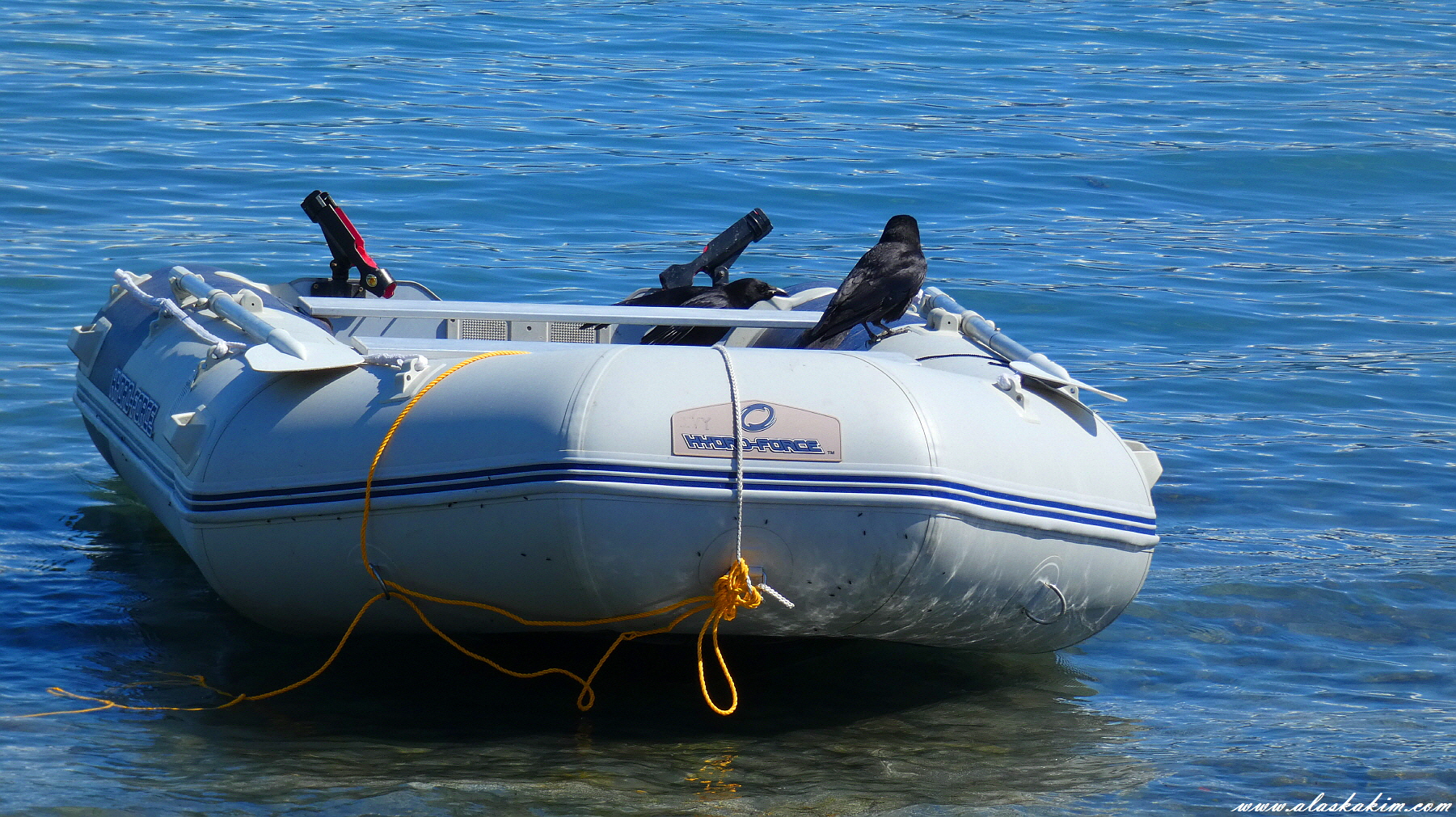 제 보트 위에 까마귀 한 마리가 낚시를 하다가 흘린 미끼를 먹기 위해서