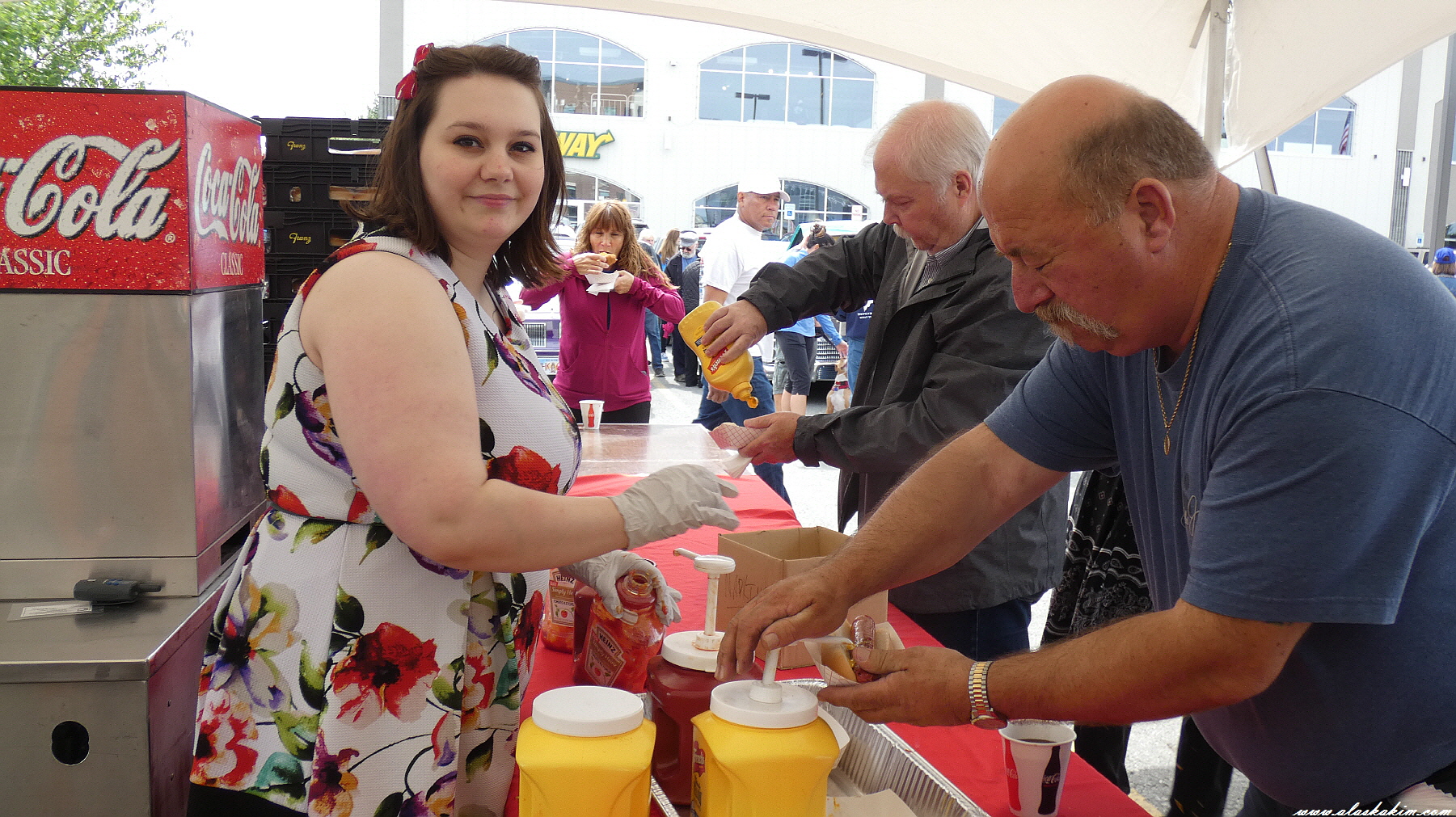 오늘 수천 명의 콘도그와 음료수를 나누어 주는 자원봉사자입니다.