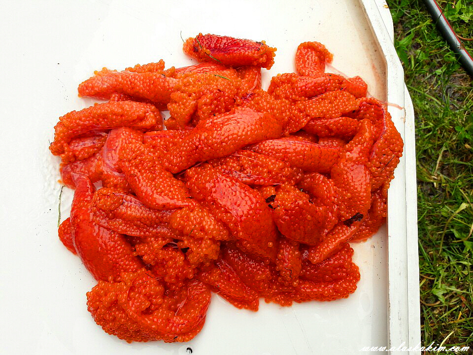 총 11마리의 연어를 이틀간에 걸쳐 잡아 그 자리에서 바로 머리와 내장을