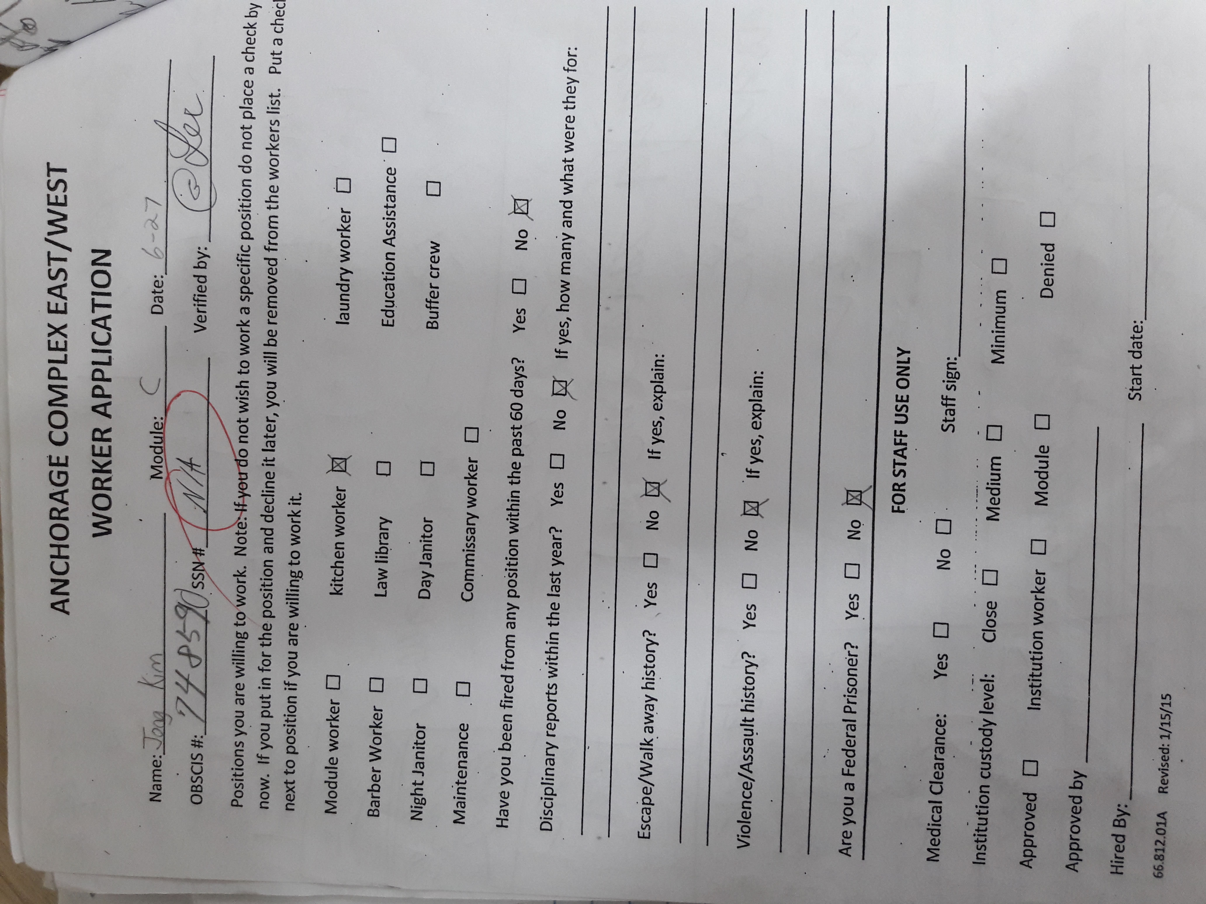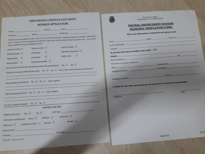 왼쪽 서류는 무료함을 달래기 위해 교도소 내에서 입을 하겠다고 job