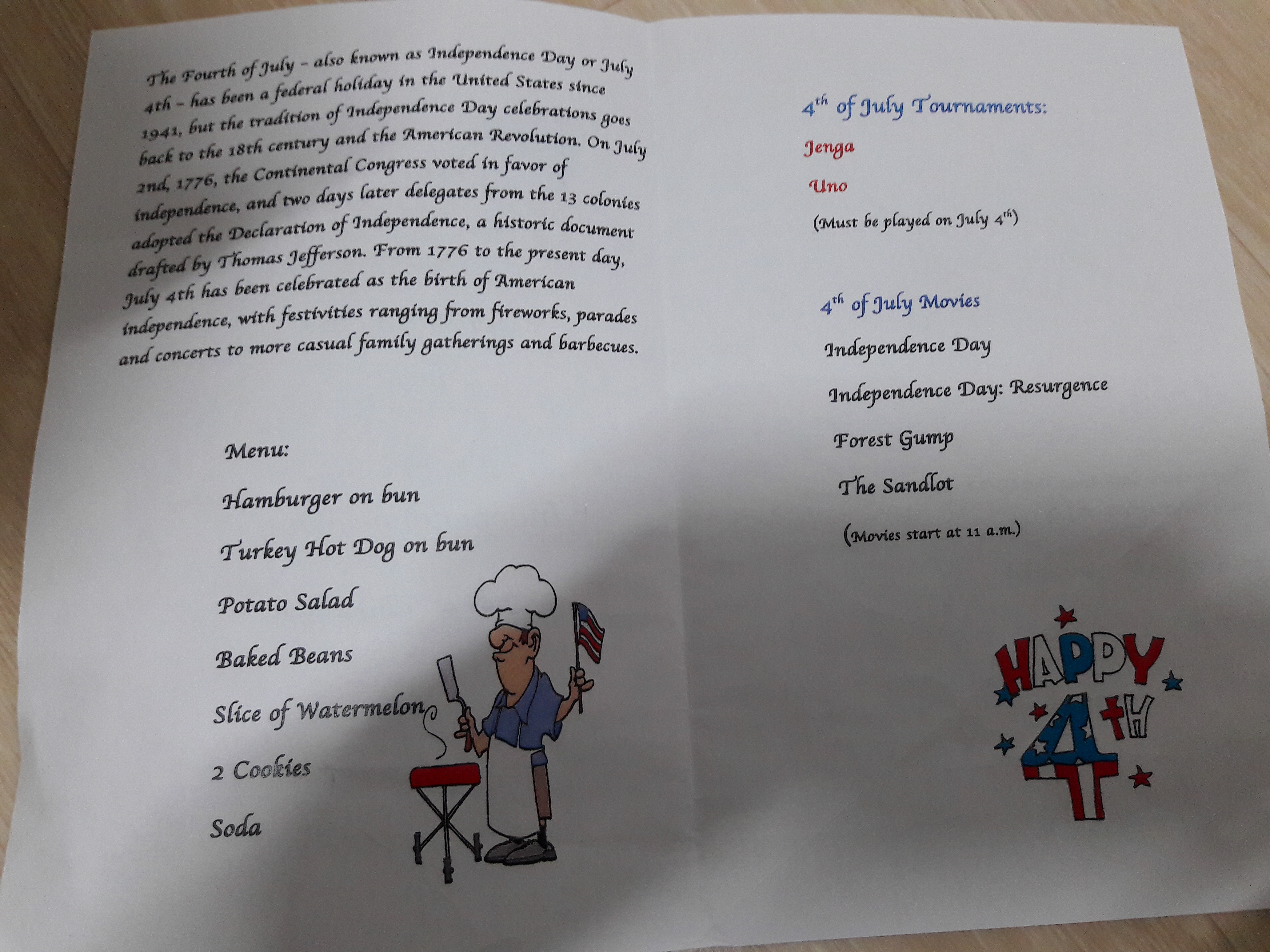 독립 기념일을 기념해서 각종 게임을 하는데 포커, 블록 쌓기, 미니 축구, 농구 등