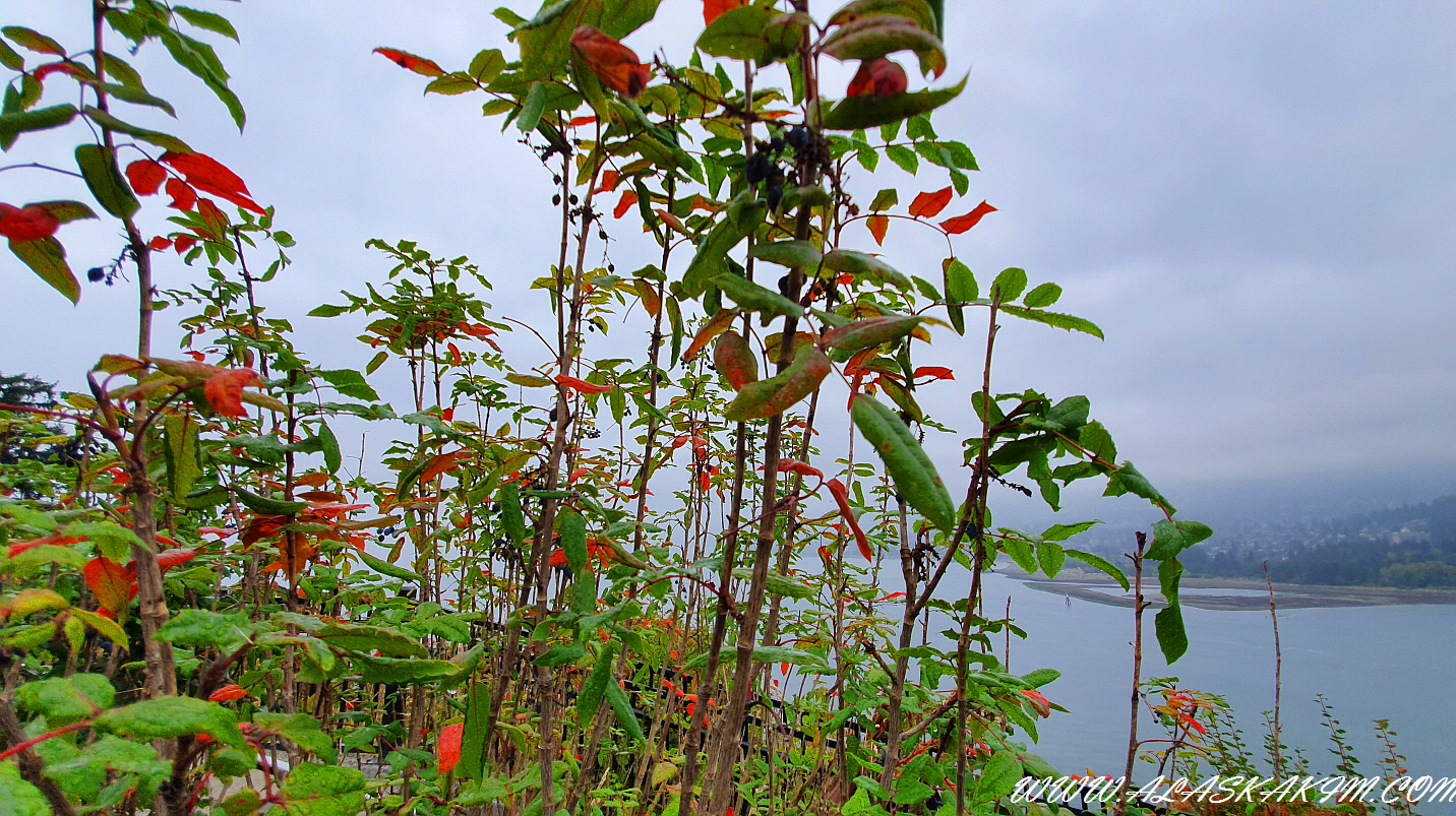 비가 내리니 단풍이 든 나뭇잎이 더욱 빛나 보였습니다.