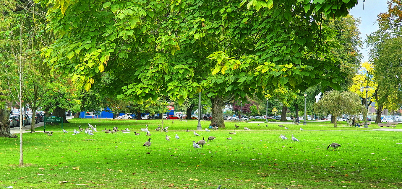 기차역 앞에 작은 공원에는 캐나다 기러기들이