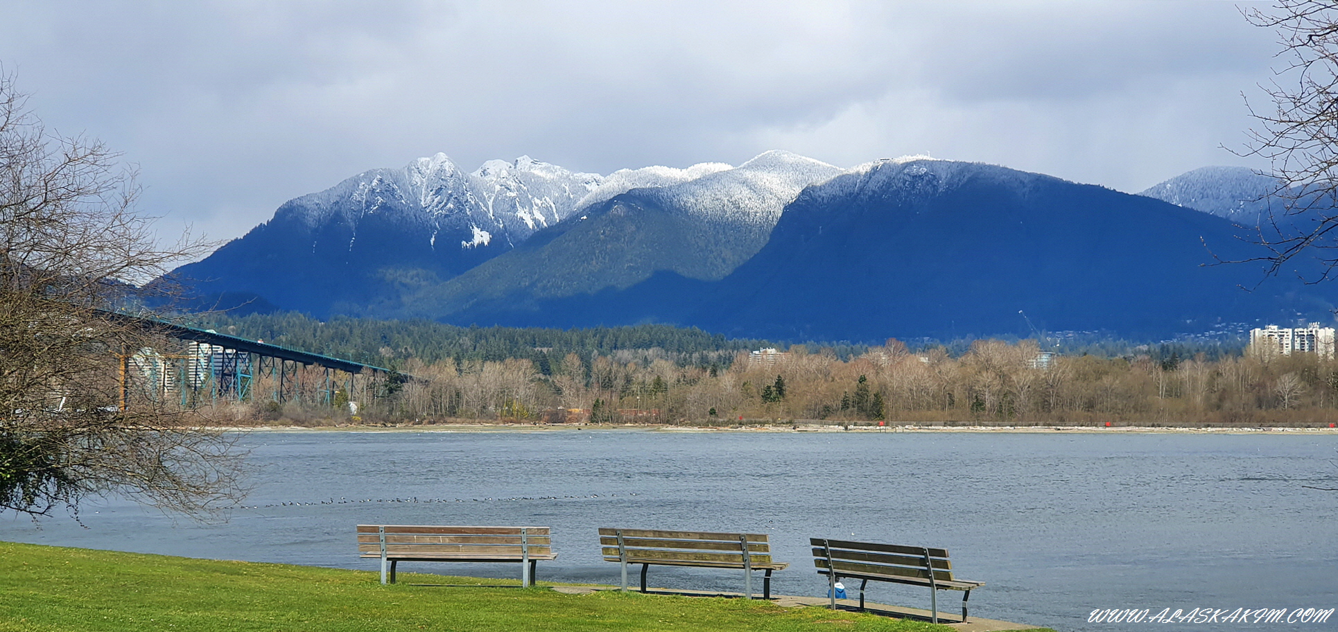 벤치에 앉아 설경과 바다를 감상하는 뷰 포인트 같습니다.