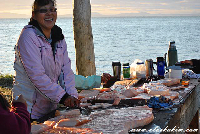 에스키모 전통 부엌칼인 " 우루"를 이용해 물개를 손질하는