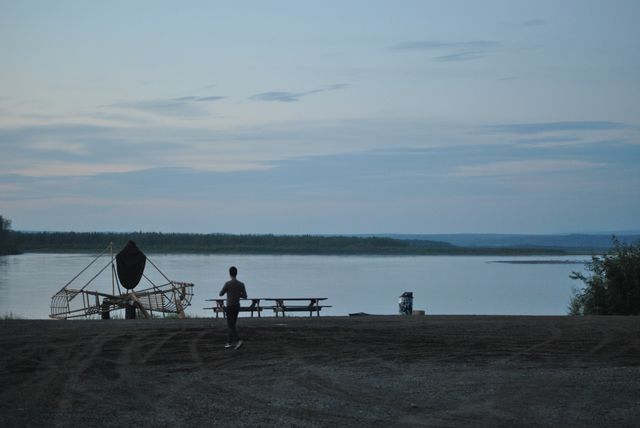 유콘 강가에 놓여있는 연어잡이 "휘시휠"과 벤치.