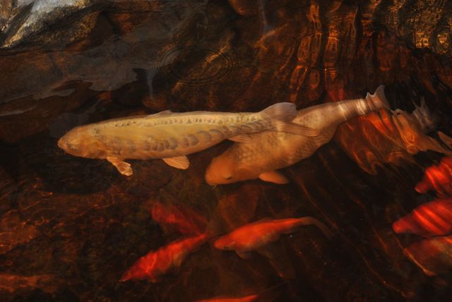 엄청 비대한 비단잉어들이 한가로이 헤엄을 치는 모습입니다.