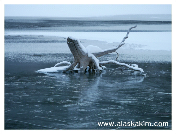 빙하의 호수 위에서 얼음땡이 되어버린 나목의 모습이