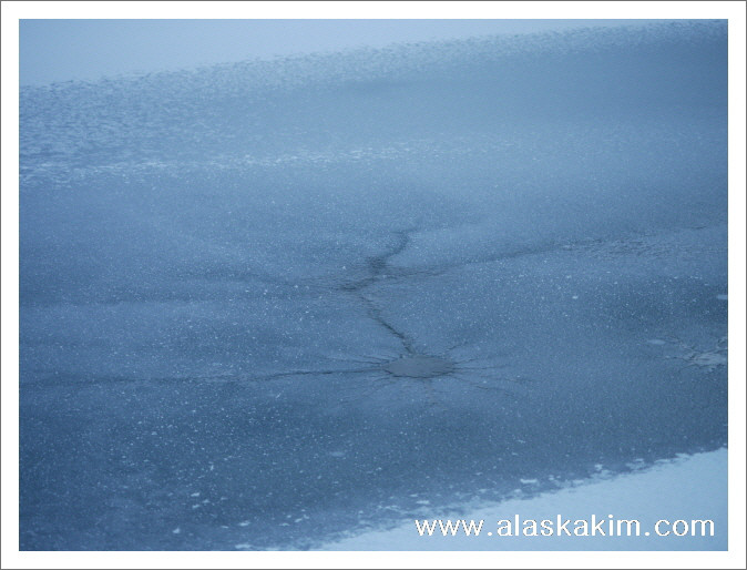 점점 얼어가는 호수 위에는 비행기가 지나간 발자국이 짙게