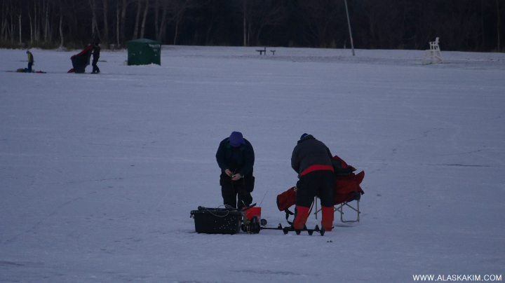 지금 막 얼음구멍을 뚫으려는 이들과 낚싯대를 접는 팀들이 있네요.