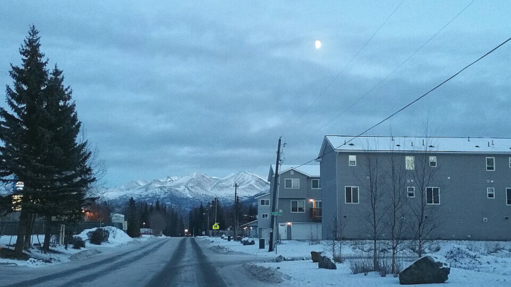 제가 사는 동네인데, 설산위에 달이 뜬 모습이 저를 기다리는 마중 나온 것 같아