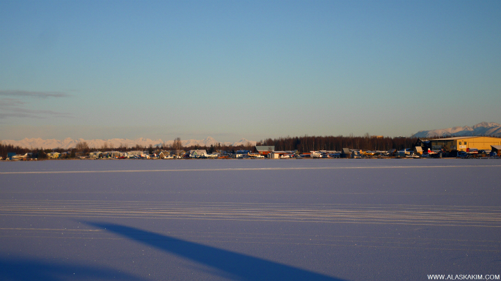 여기는 알래스카 최대의 수상 경비행장인 호수인데, 겨울에는 꽁꽁 얼어